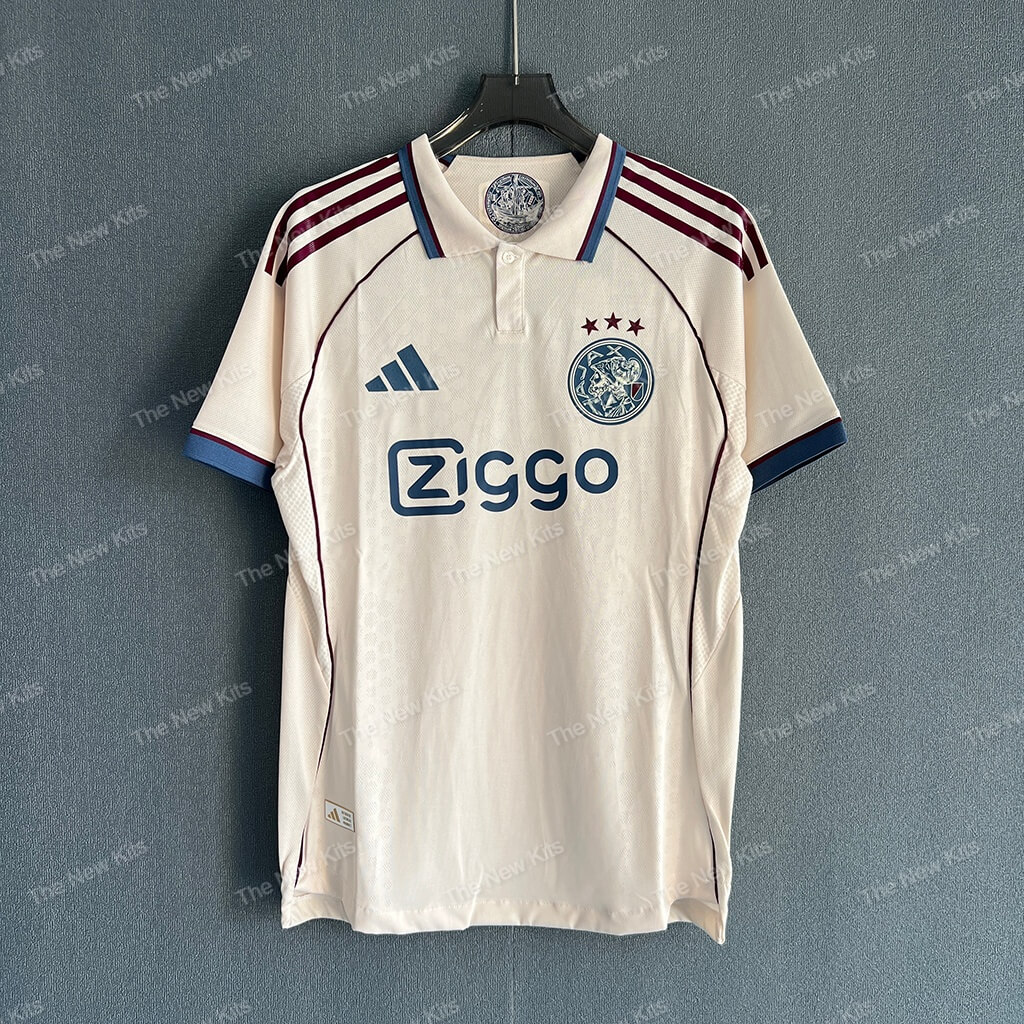 Short excerpt (1–2 lines) — The ajax amsterdam kit 25/26 third player version is a pale, heritage-leaning jersey with claret and blue trims. Player-fit, detail-rich, and made for matchday moments.