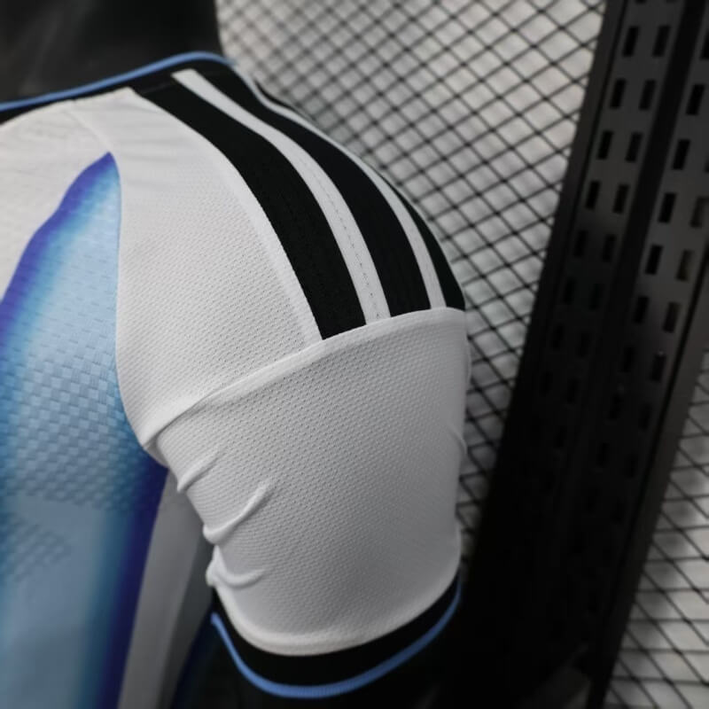 Command the pitch in the Argentina World Cup kit 2026 home shirt, player version. The classic Albiceleste stripes are reimagined with a modern gradient texture that catches the light, while crisp black detailing at the collar and shoulders adds definition. A gold AFA crest with three stars celebrates the nation’s world titles and anchors the design at center stage—clean, confident, unmistakably Argentina.