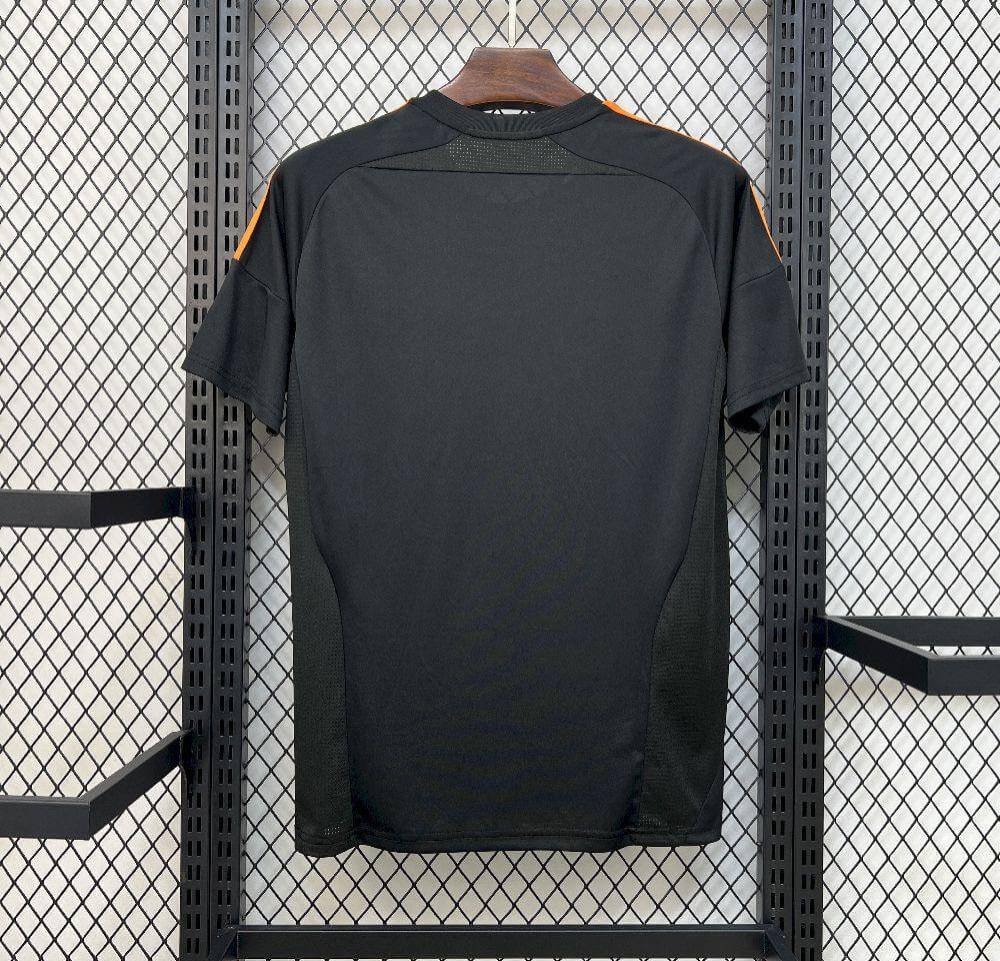 A deep black body sets the stage for sharp contrast lines that contour the torso for a fast, modern silhouette. The shoulder tape features three stripes in warm sunset tones—a gradient of orange and red that adds instant punch without shouting. Subtle mesh panels at the sides help the jersey breathe, while light contrast piping traces the seams for a tailored, athletic look.