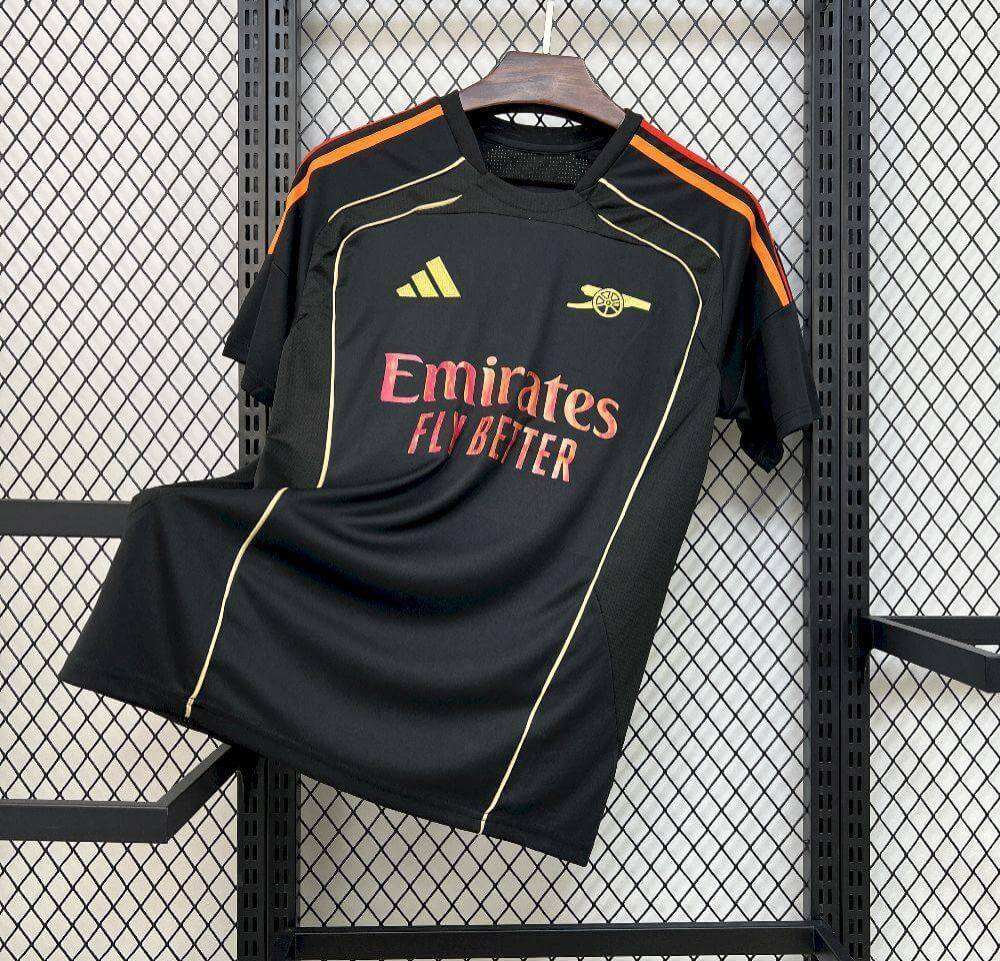 Own the night in the Arsenal NTS Kit 25/26, a striking black jersey that blends terrace culture with performance-ready details. Bold piping frames the body, vivid triple stripes ride the shoulders, and a clean cannon crest sits proud on the chest. Front and center, the NTS mark pops with a layered gradient treatment and the club’s timeless motto beneath: Victory Through Harmony. It’s a statement piece built for matchday energy, late-night sessions, and everyday wear.