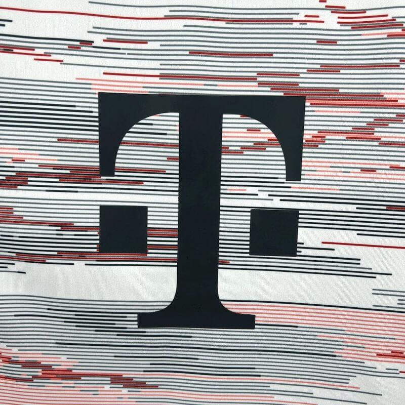 The subtle camo-like pattern in shades of soft red and light gray adds dynamic energy and depth to the white canvas, creating a modern and eye-catching effect. Red piping outlines the raglan sleeves and hem, reinforcing the club’s traditional colors with a contemporary twist. The iconic Bayern Munich crest and Adidas logo sit proudly on the chest in a sleek black finish, while the Telekom sponsor completes the look with a clean, bold presence.