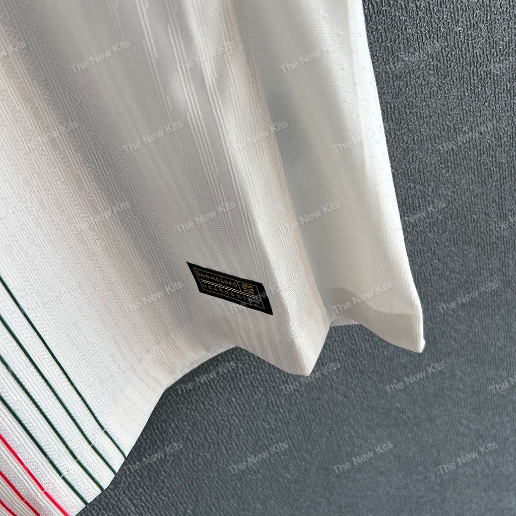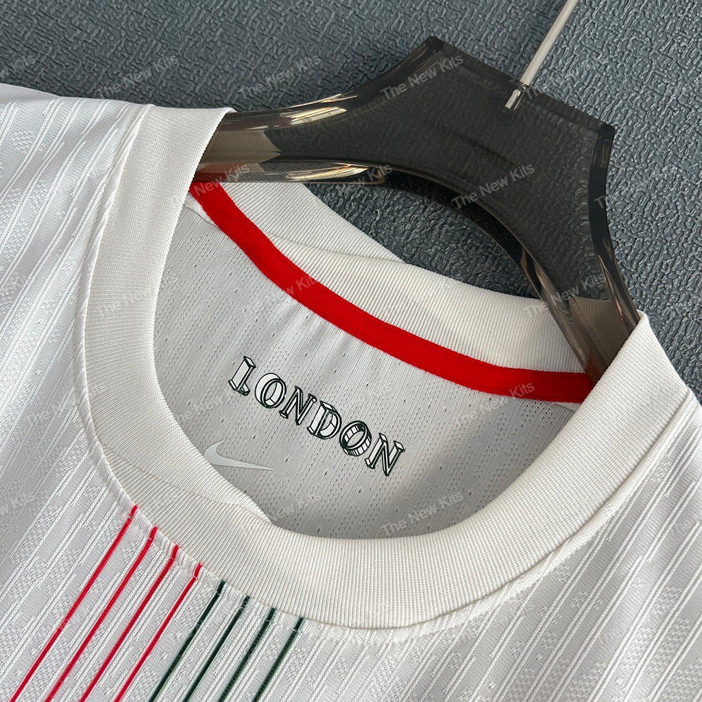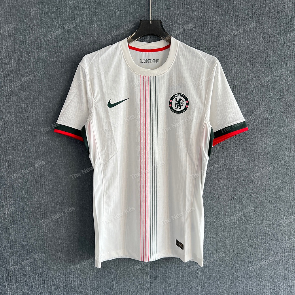 The Chelsea 25/26 away kit boasts a sleek off-white base, complemented by striking red and green vertical pinstripes. The color scheme pays tribute to Chelsea’s rich history while introducing a fresh and contemporary look. The club crest and Nike logo are seamlessly integrated into the design, delivering an authentic and stylish appearance.