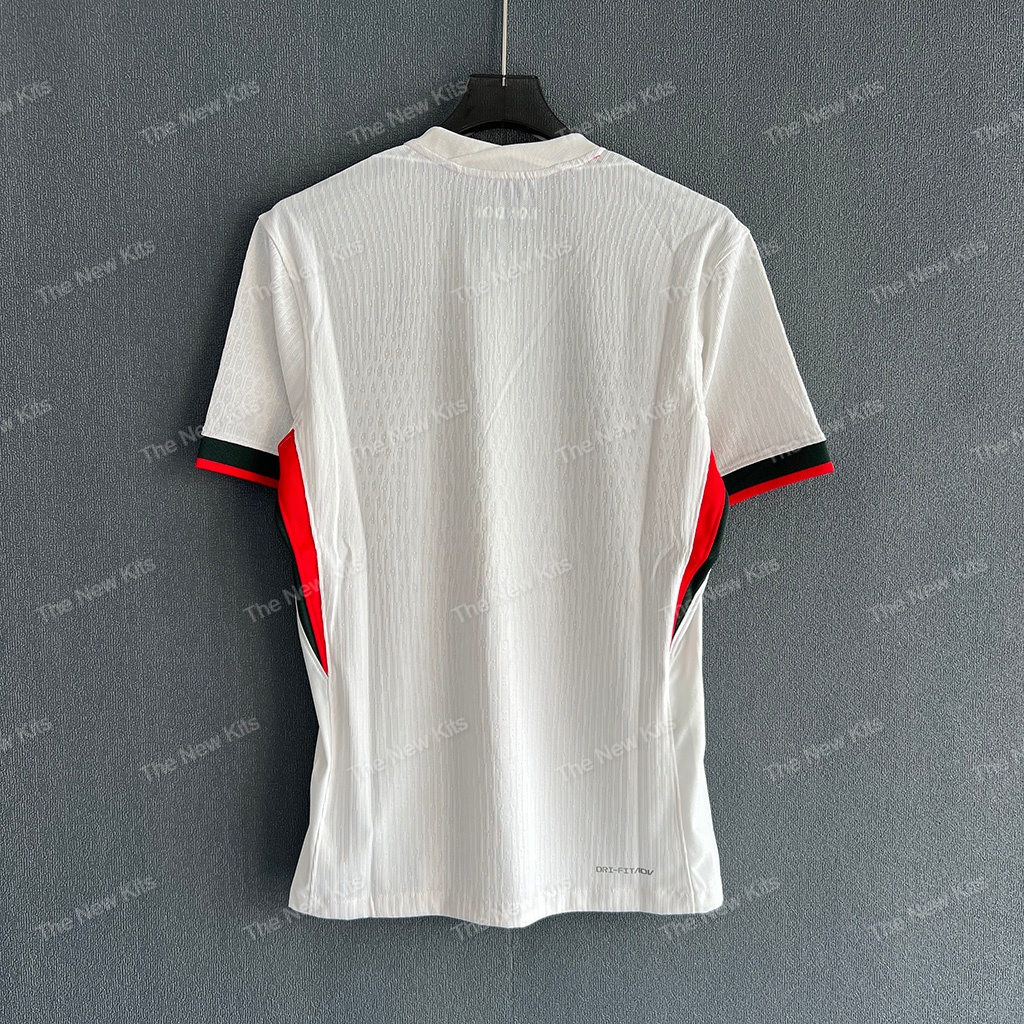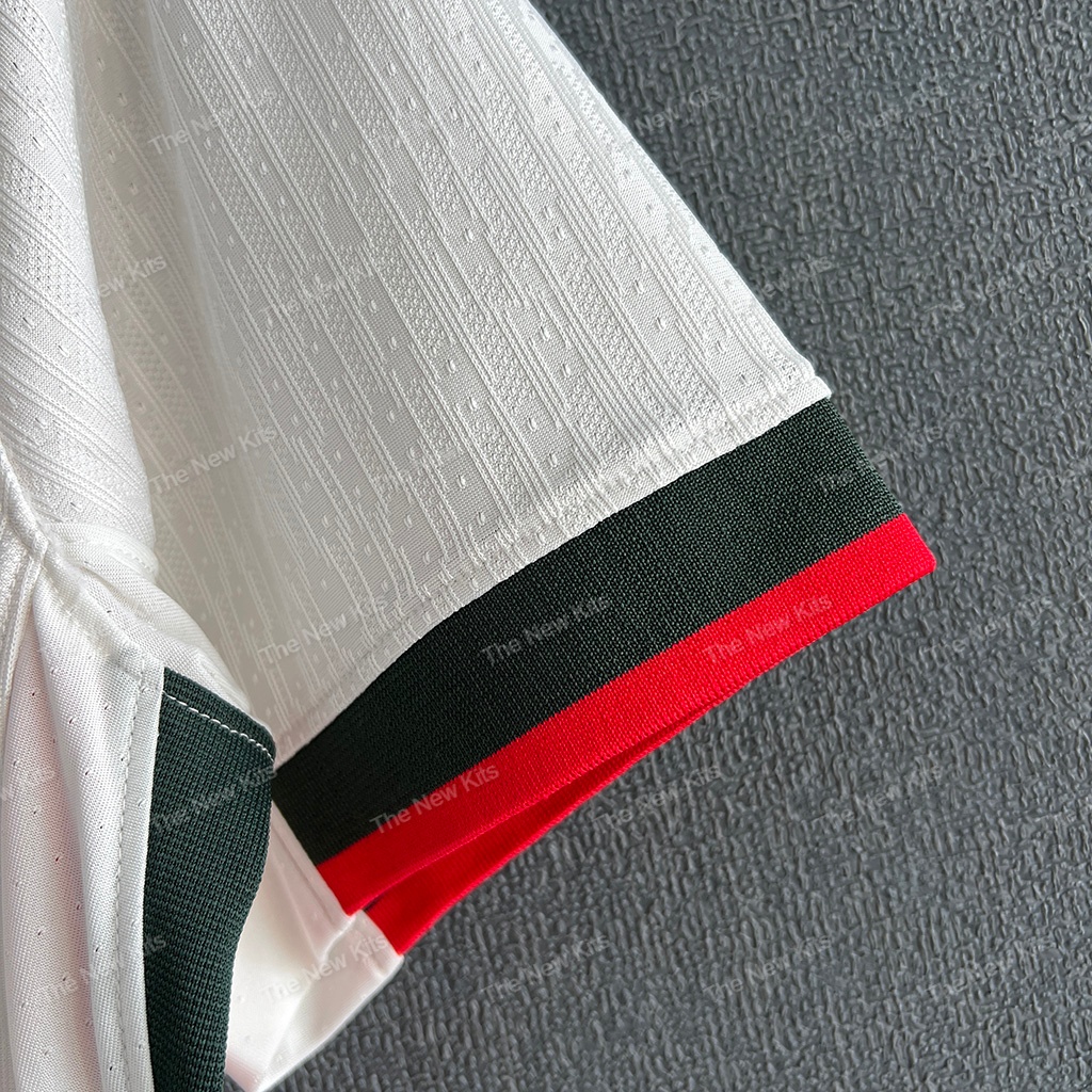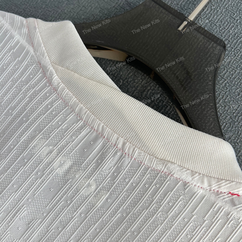 The Chelsea 25/26 away kit boasts a sleek off-white base, complemented by striking red and green vertical pinstripes. The color scheme pays tribute to Chelsea’s rich history while introducing a fresh and contemporary look. The club crest and Nike logo are seamlessly integrated into the design, delivering an authentic and stylish appearance.