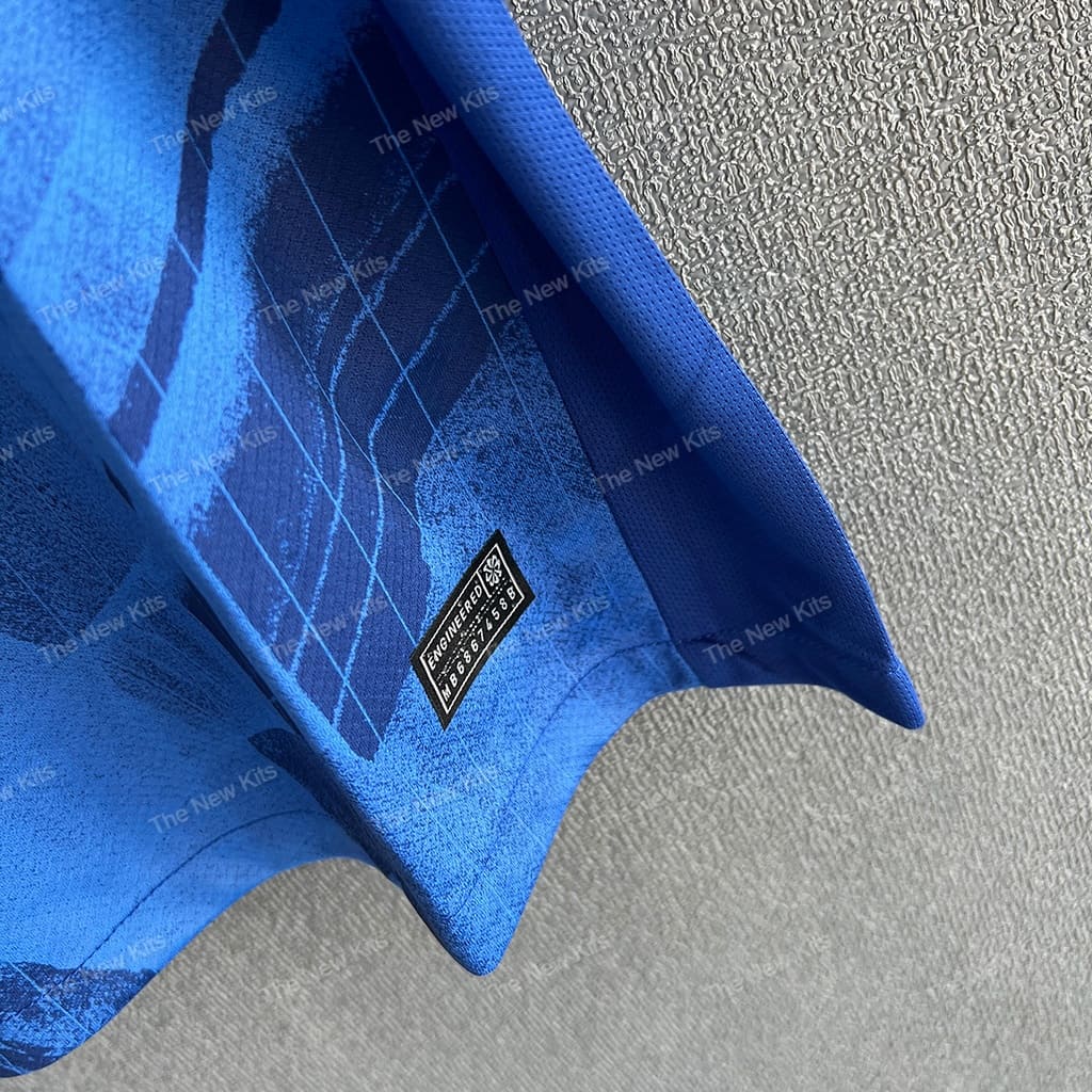 The Chelsea 2025 kit is steeped in the club’s rich history. It features a bold royal blue base, complemented by subtle graphic patterns inspired by architectural icons around Stamford Bridge. These tonal graphics give the shirt depth and honor the landmarks that have been a part of Chelsea’s journey. A clean white v-neck collar adds contrast and elegance, staying loyal to the club’s classic identity.