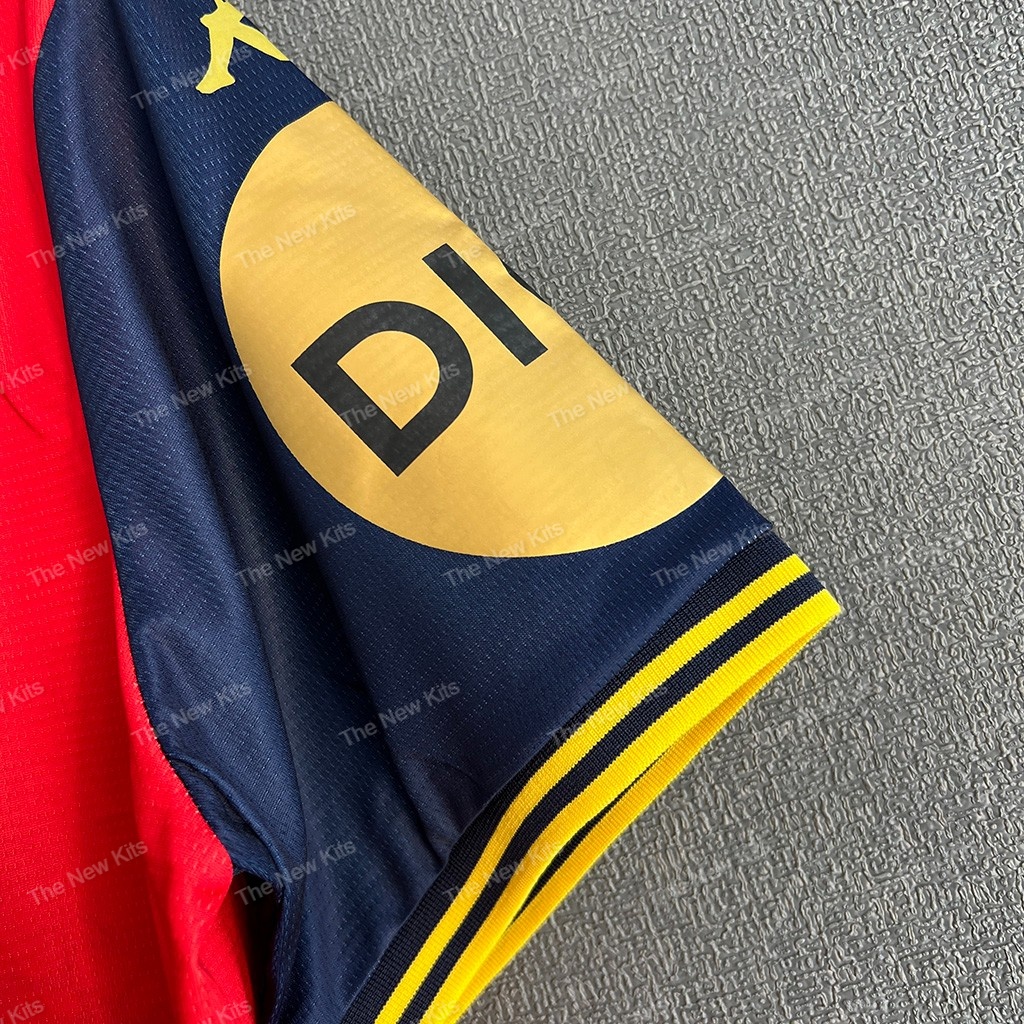 The blue mosaic sash is more than decoration: it’s a layered motif referencing seaside tiles, cobbled promenades and local landmarks. Up close you’ll find subtle tonal icons — shells, compass roses and small emblems — that add texture without cluttering the silhouette. Gold Kappa badges and sponsor treatments give the shirt a premium contrast that pops in stadium lights.