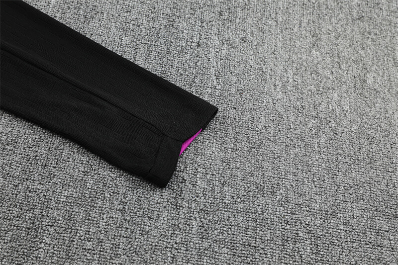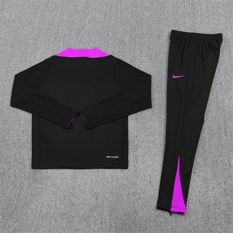 Level up every session with the england football tracksuit for the 2025/26 season. This two-piece Nike set pairs a long-sleeve quarter-zip top with slim tapered pants in stealth black finished by bold purple shoulder and calf inserts. A monochrome Three Lions crest signs off both pieces for a clean St. George’s Park look—perfect for warm-ups, gym work, travel days and everyday streetwear.