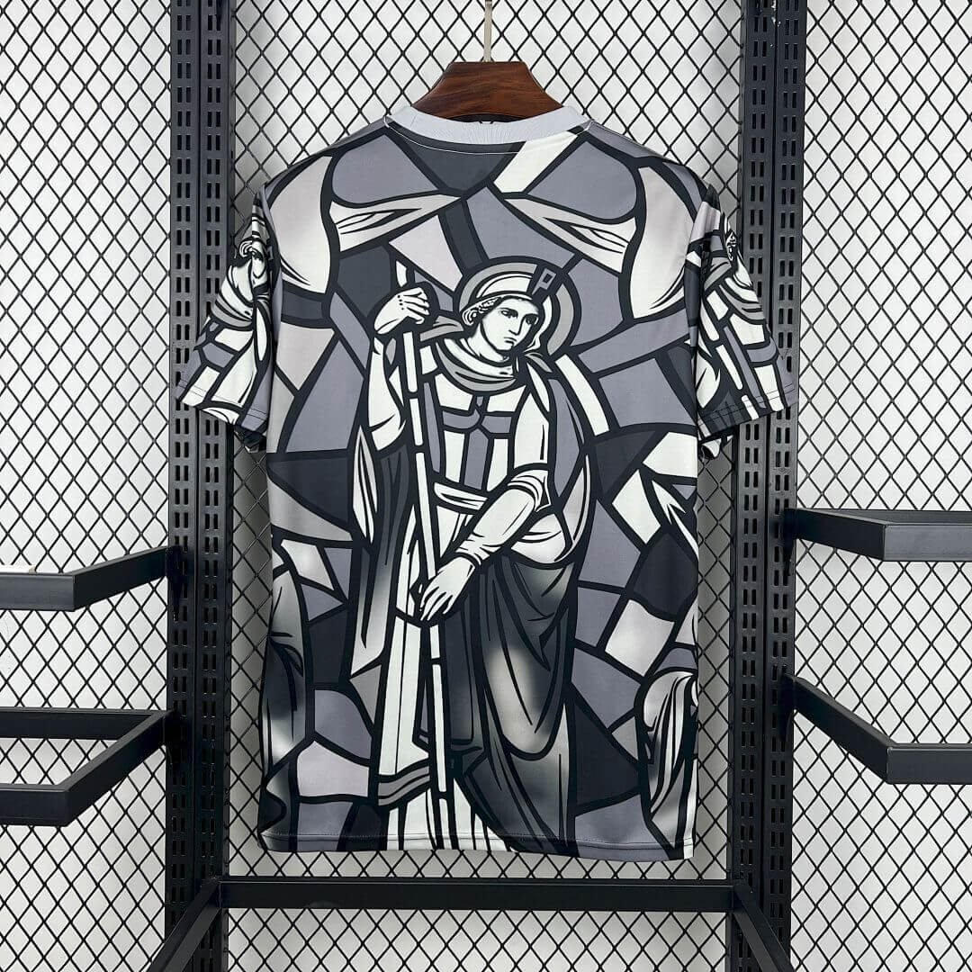 The england palace kit features a sophisticated “Grey & Silver” grayscale palette for a sharp, authoritative silhouette. 🛡️ Specifically, the design showcases a stunning, all-over stained-glass graphic depicting St. George, the patron saint of England. This artistic approach provides a bold update to the england shirt 2024 lineage while maintaining a historic identity. ✨
