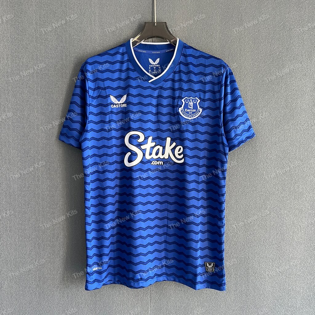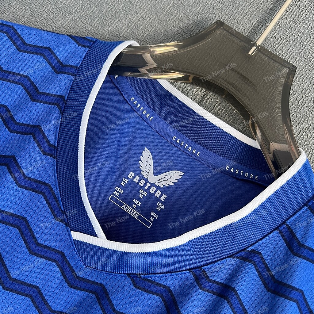 The Everton crest sits proudly on the left chest in embroidered white. Opposite, Castore’s winged logo balances the design. Front and center, the “Stake.com” sponsor logo integrates seamlessly into the wave pattern, its clean white typeface standing bold against the ripples.