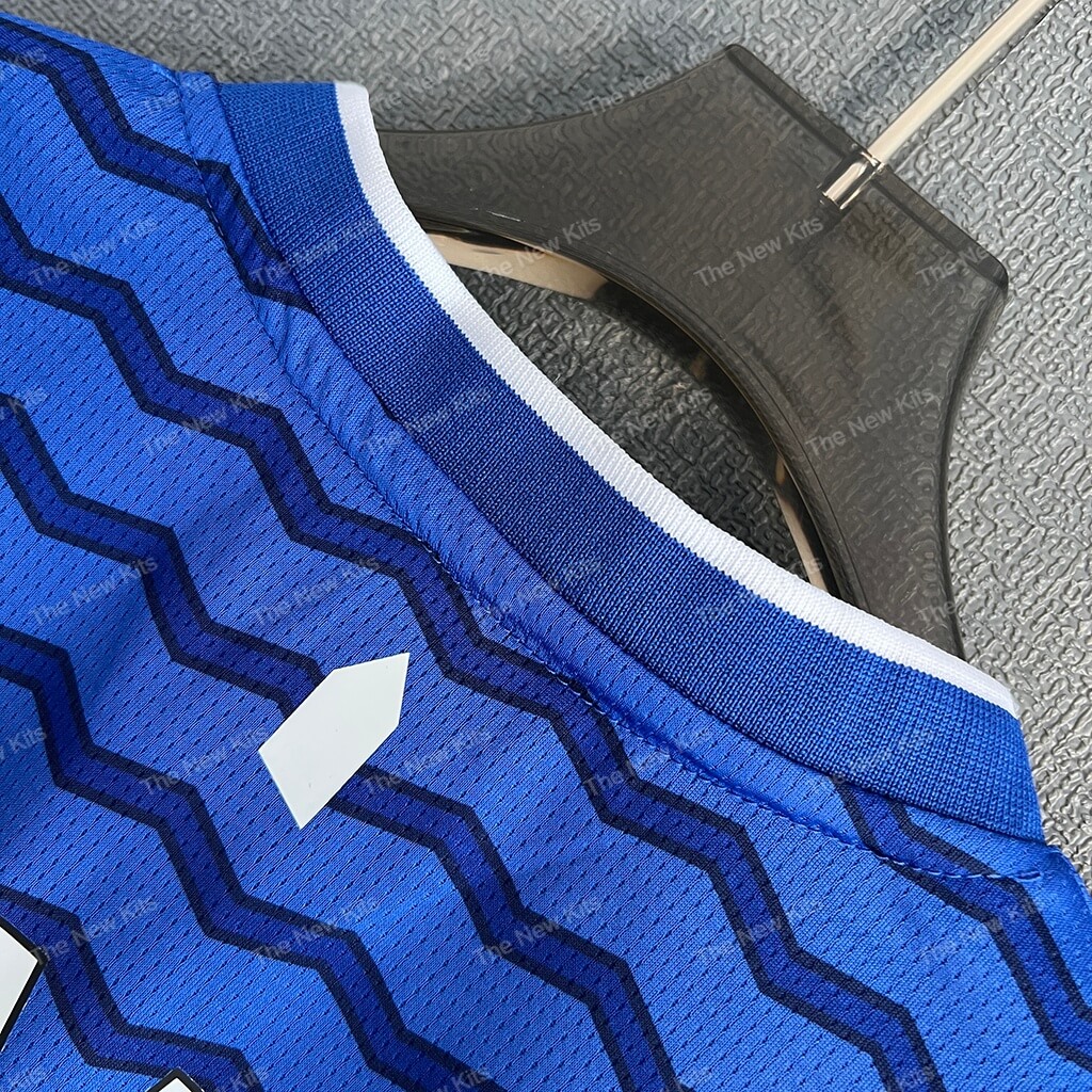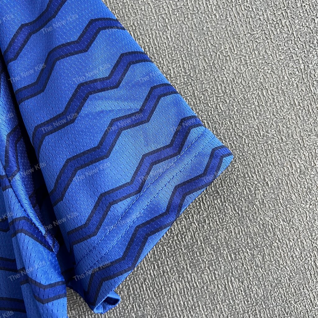 A crisp white V-neck collar frames the throat, lending a sharp contrast to the rich blue. Raglan sleeves ensure unhindered movement, while the shirt’s tapered silhouette flatters every shape—from match-day heroes to passionate fans.