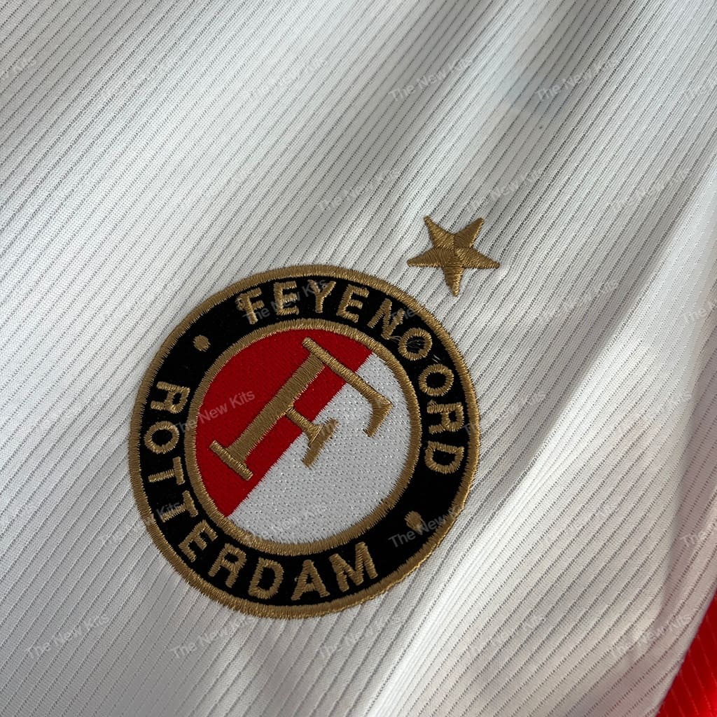 The MediaMarkt logo appears in black and gold on the front. It fits perfectly with the kit’s colors without being too bold. Meanwhile, the club badge sits proudly on the chest, complete with a gold star that shows Feyenoord’s success.