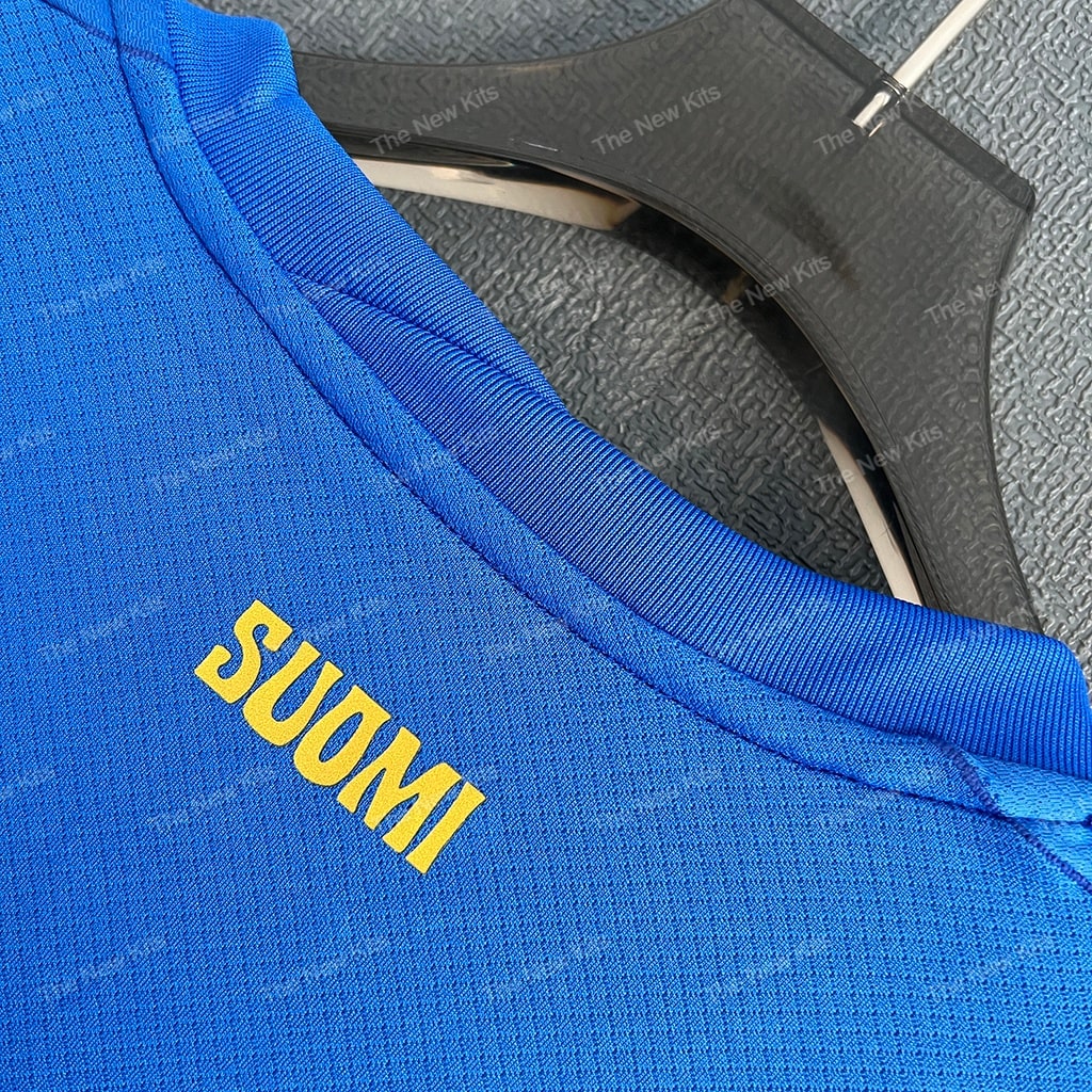 Several subtle touches enrich the kit’s identity. The Finnish flag crest on the chest is outlined in gold, symbolizing excellence and aspiration. Above the back collar, the word “SUOMI” (Finnish for Finland) is embroidered in gold, reinforcing the kit’s patriotic spirit. Meanwhile, the sleek Nike swoosh, also rendered in gold, complements the overall design, creating a harmonious balance between tradition and modern branding.