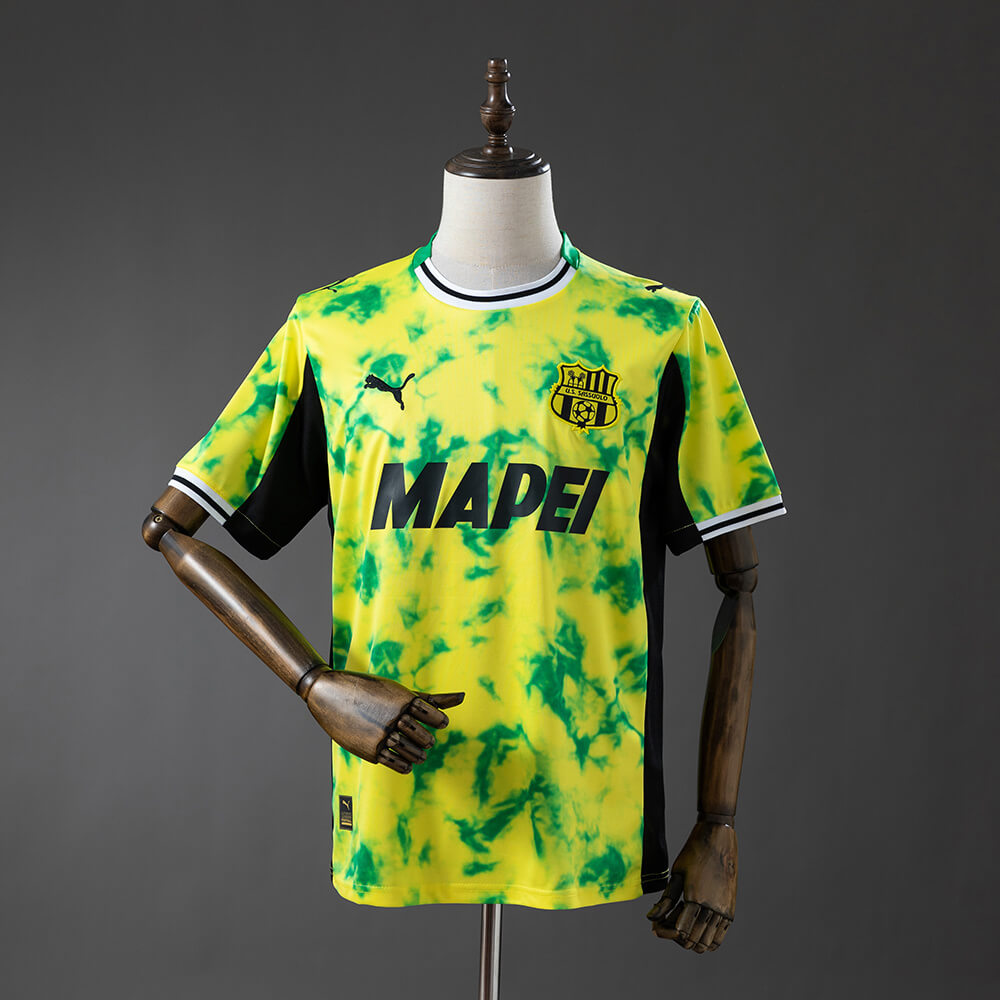 The standout feature of this jersey is the mesmerizing tie-dye pattern. A seamless fusion of “Electric Yellow” and “Neroverdi Green” covers the torso, ensuring that whether you are under the stadium lights of the Mapei Stadium or walking the streets of Reggio Emilia, you remain the center of attention.
