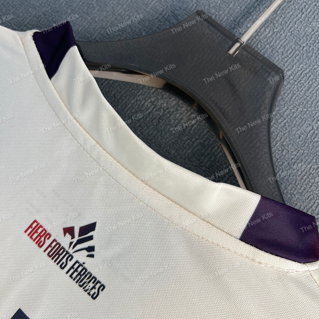 The Lille soccer jersey 25/26 away kit immediately catches the eye. Its rich purple base is accented by a vivid pattern of pink and mauve cityscape motifs. This daring design represents the spirit of Lille and creates a striking visual impact. As a result, it stands out in any stadium.