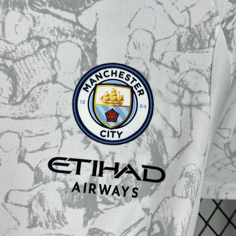 At first glance, the Man City away kit 25/26 captivates with its clean, white base layered with intricate, almost ghost-like sketches. These delicate patterns pay homage to Manchester’s rich industrial and cultural heritage, subtly embedded throughout the jersey’s surface. The monochrome background serves as the perfect canvas for the bold, vertical stripes running down the left side—one red and one black—injecting a fierce contrast that commands attention on the pitch.