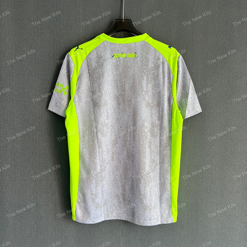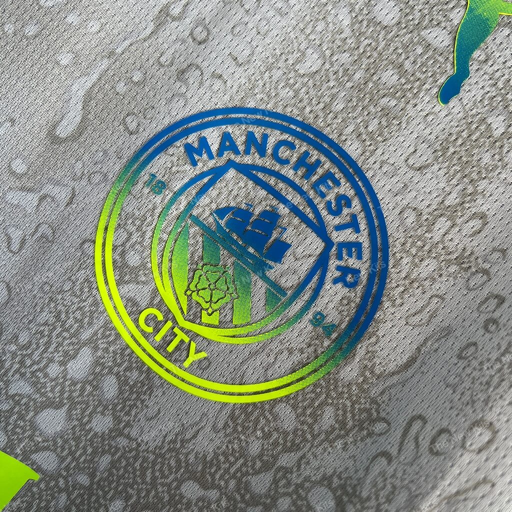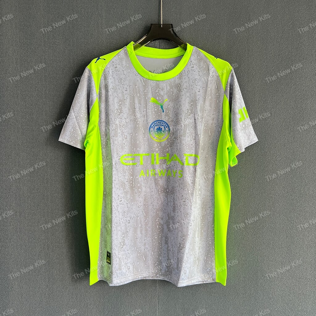 The Man City new football shirt 25/26 Third (Player) is a concept-led kit that turns Manchester mood into matchwear. The cool-grey base carries a subtle raindrop texture across the body. Then neon green trims punch the silhouette so the shirt reads clearly under stadium lights and on TV.