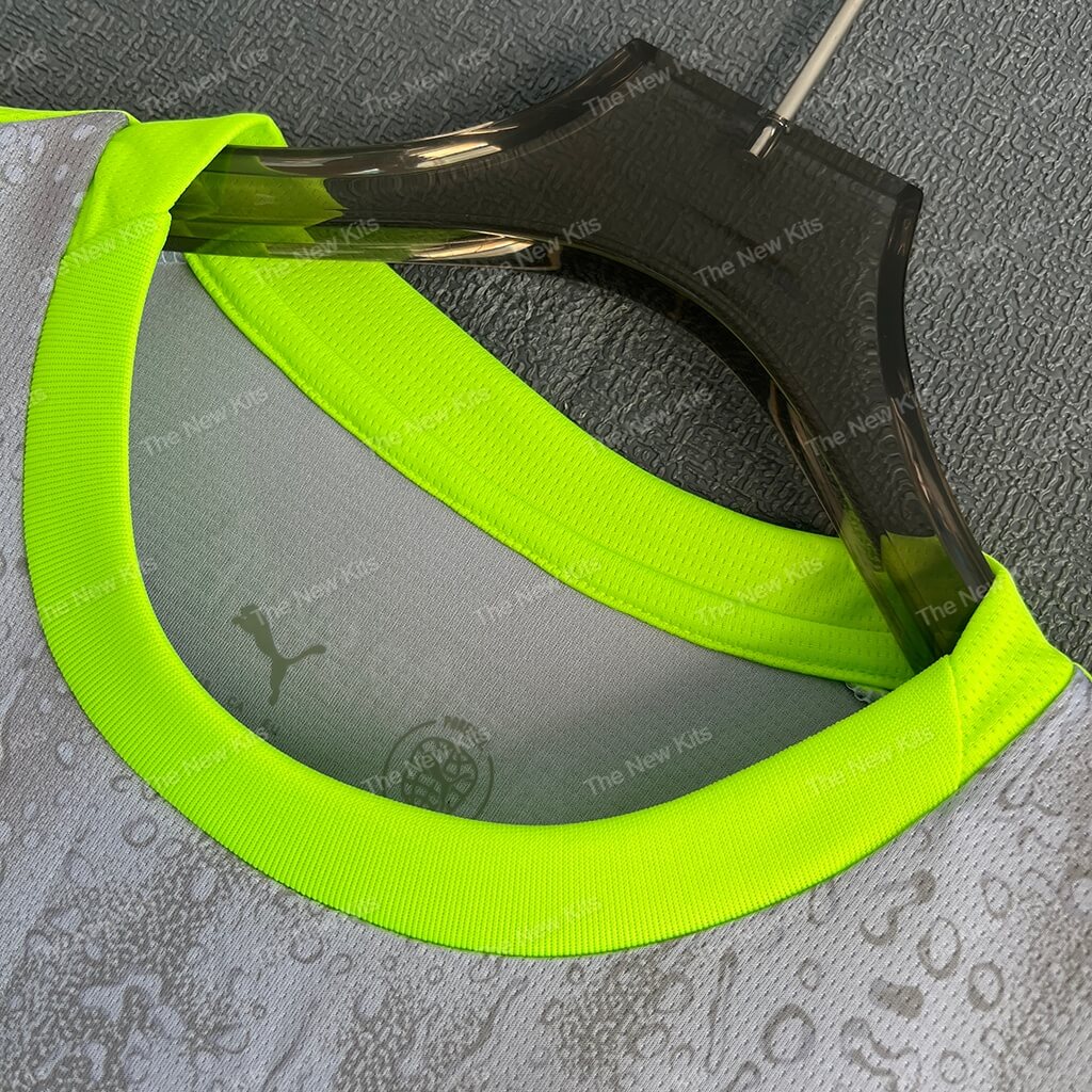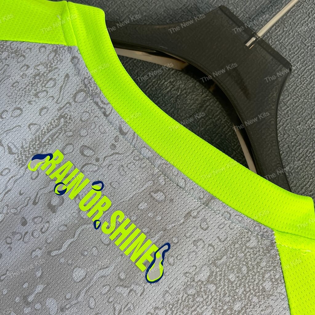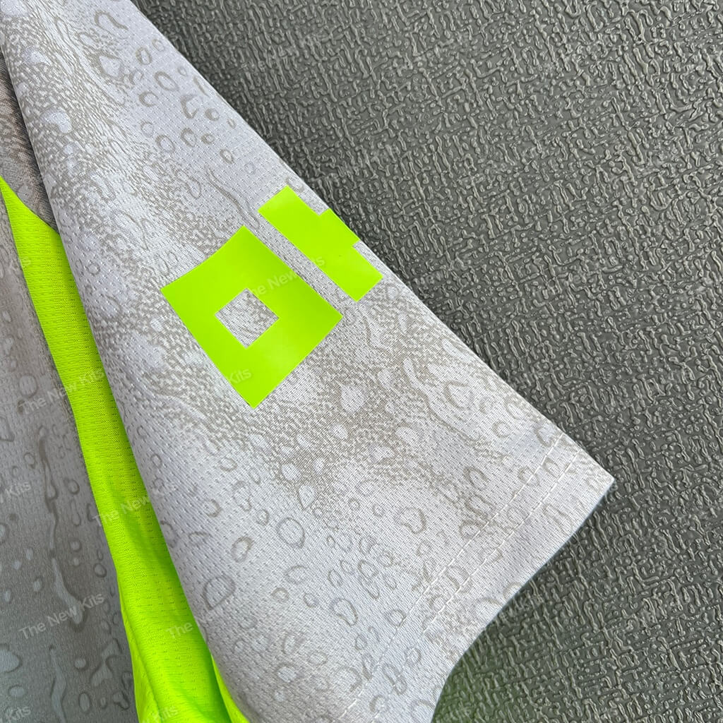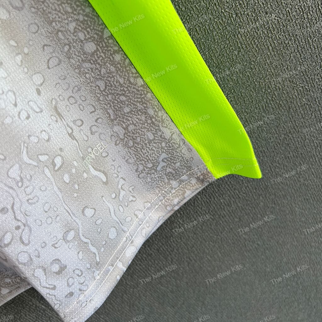 The Man City new football shirt 25/26 Third (Player) is a concept-led kit that turns Manchester mood into matchwear. The cool-grey base carries a subtle raindrop texture across the body. Then neon green trims punch the silhouette so the shirt reads clearly under stadium lights and on TV.