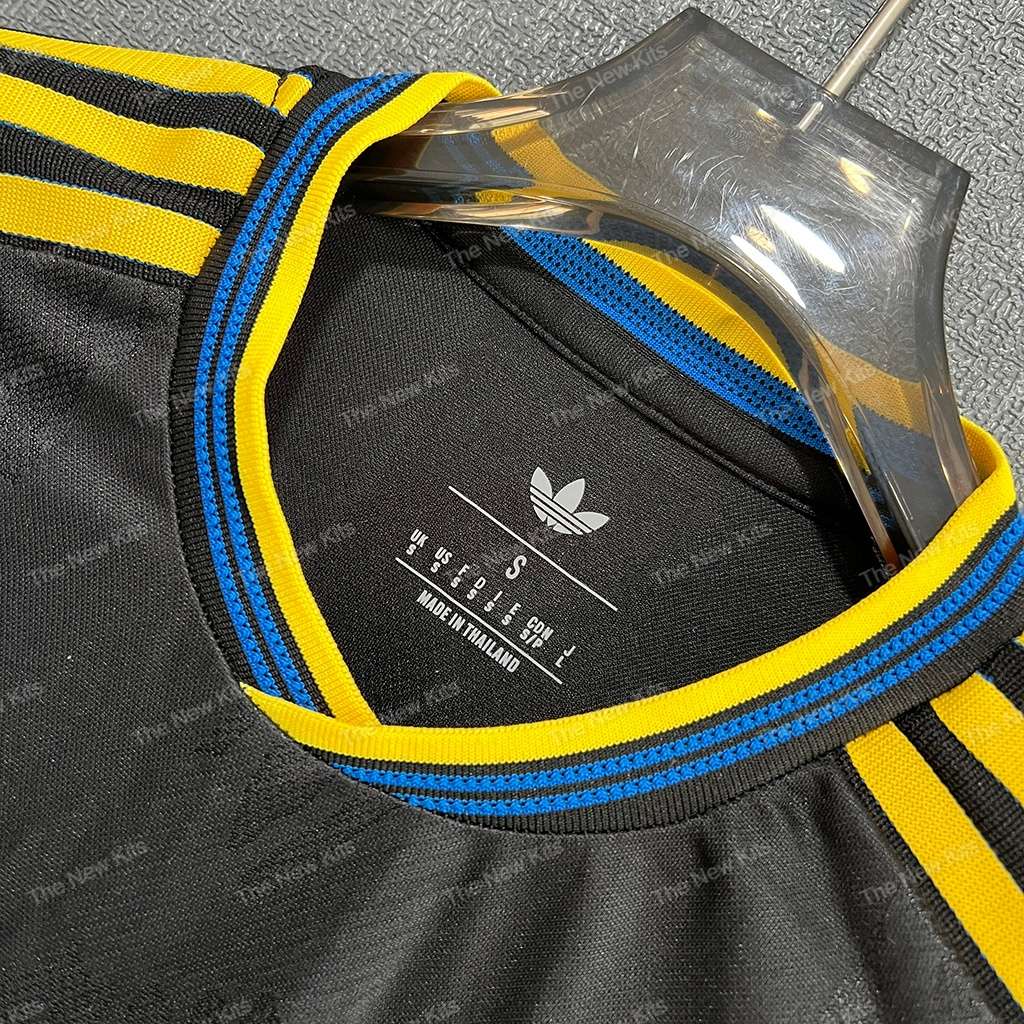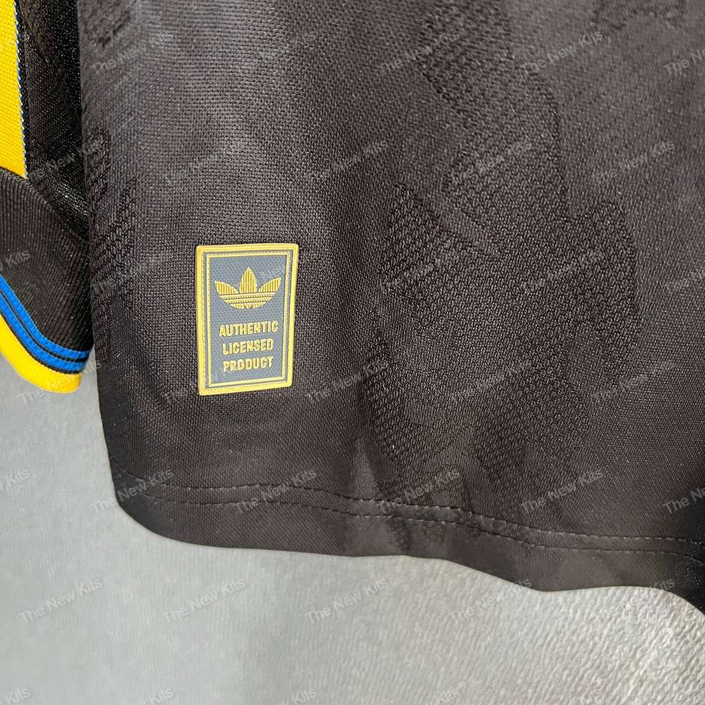 Built for statement away days, the shirt uses a deep black body with a subtle woven pattern for depth. Three bold yellow stripes run the length of each sleeve, matching the chest branding for a clean, powerful read under stadium lights. The round neck features blue-and-yellow tipping that ties the palette together, while the club crest is reworked in black, blue, and yellow for a unified finish.
