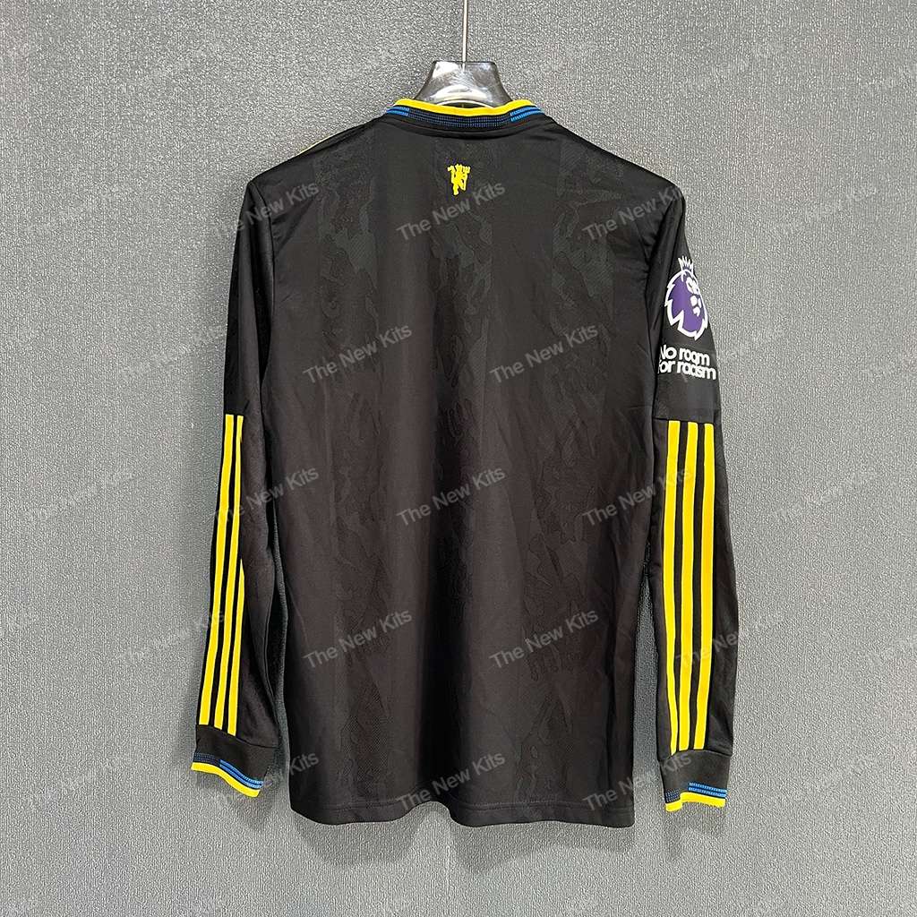 man united third shirt 25/26 – long sleeve player version • Black base • Yellow stripes & branding • Blue/yellow trim • Breathable quick-dry knit • Slim competition fit • Heat-applied details