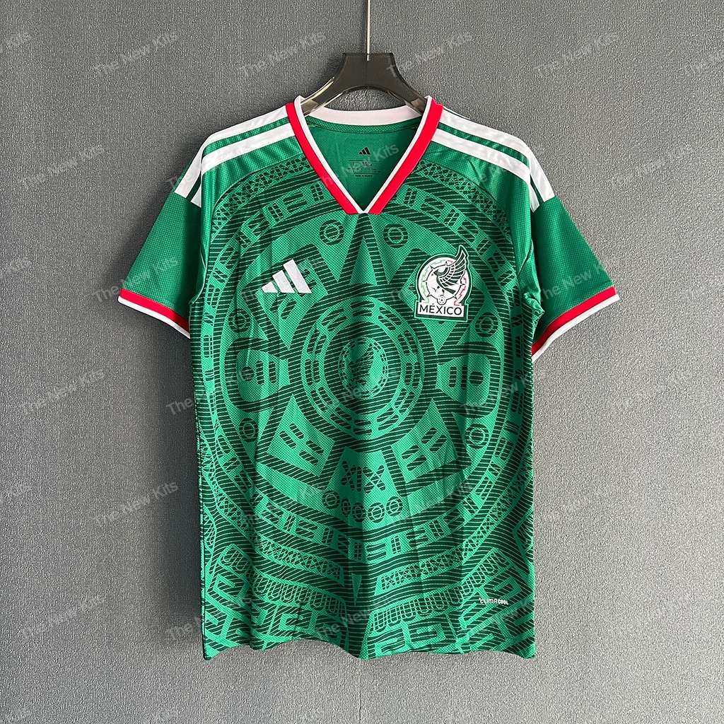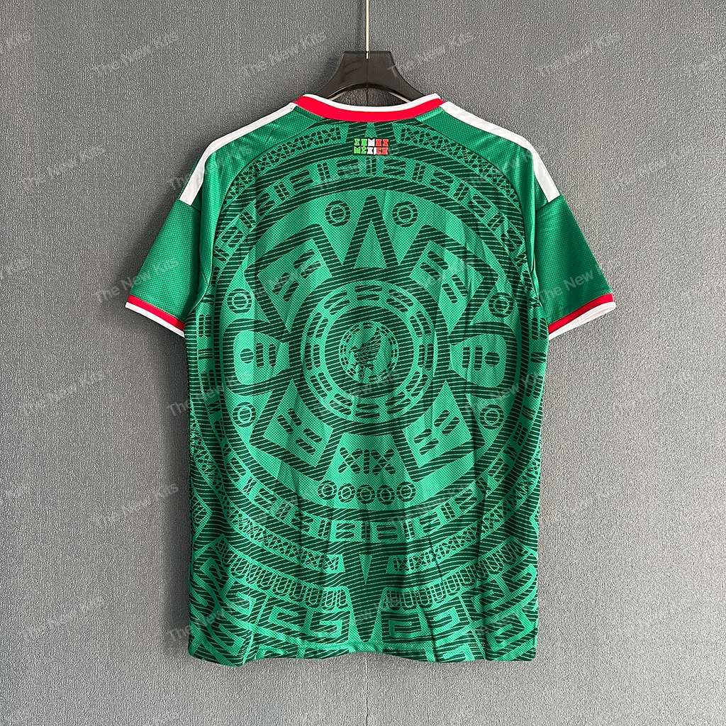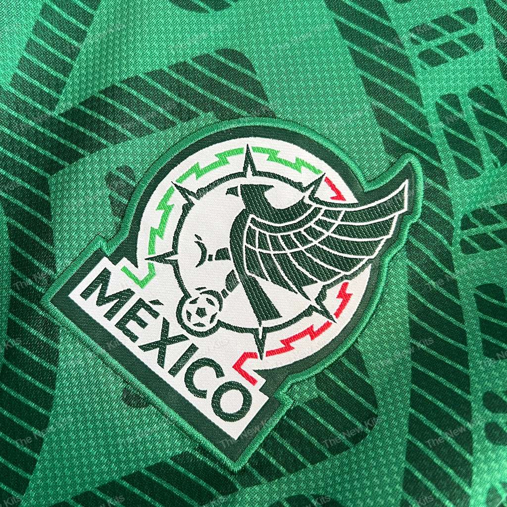 • Tricolor details: deep green with white shoulder stripes and red pops on the V-neck and cuffs—unmistakably México.