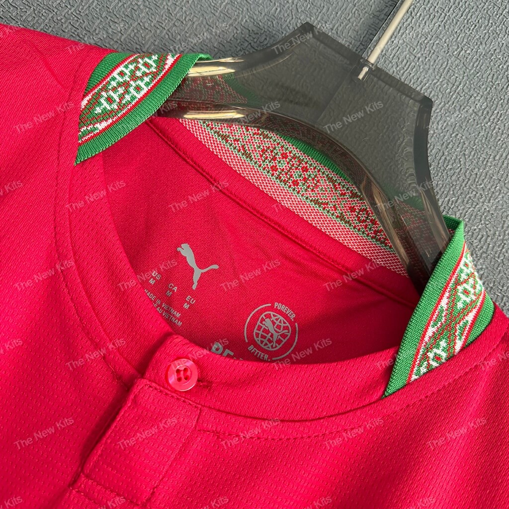 The morocco national football team kit features a vibrant red base that represents the national flag and the team’s identity. This version introduces a refined look with green side panels and thoughtful cultural details. Furthermore, a closer look reveals unique decorative patterns on the collar and sleeve cuffs.