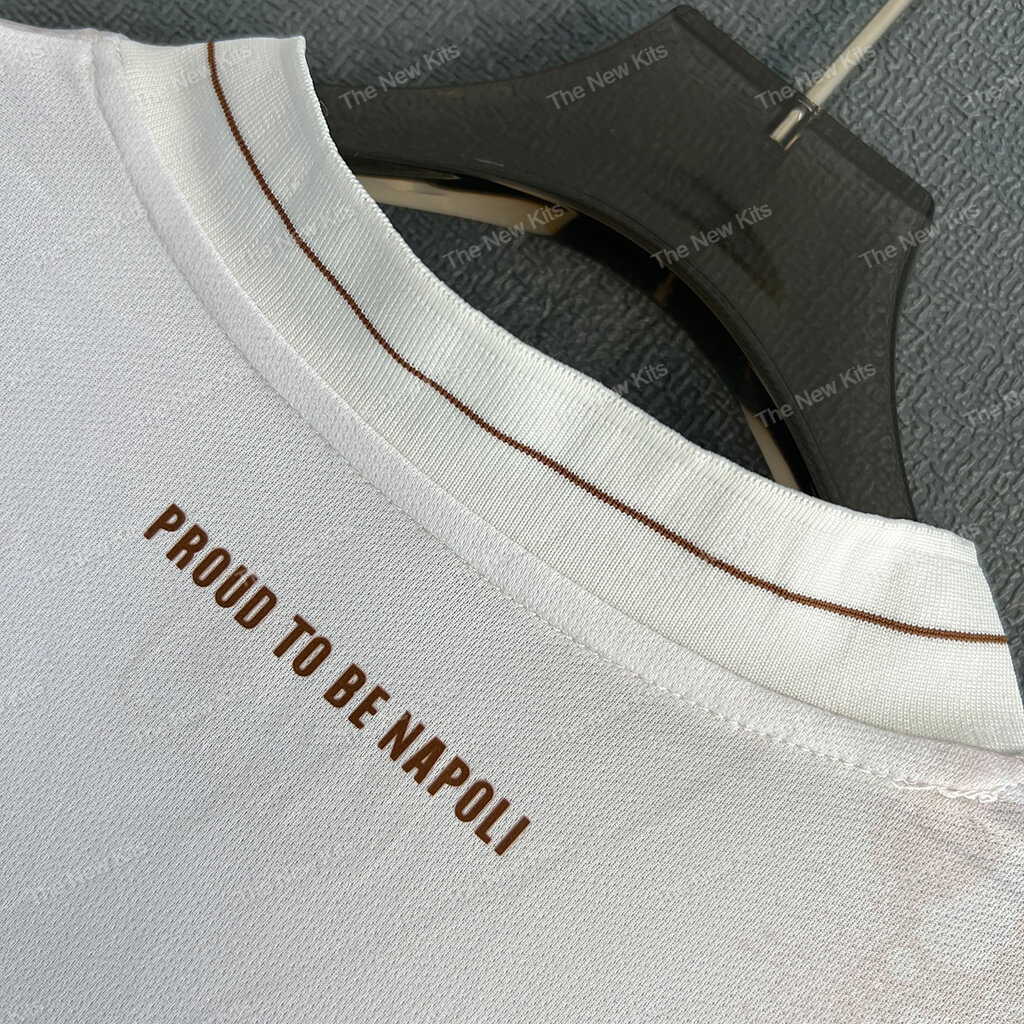 The collar and sleeve cuffs shimmer with gold trim—not as mere decoration but as accents of pride. On the upper back lies the phrase “Proud to be Napoli,” softly printed, anchoring the garment in emotion and belonging. Footy Headlines+1