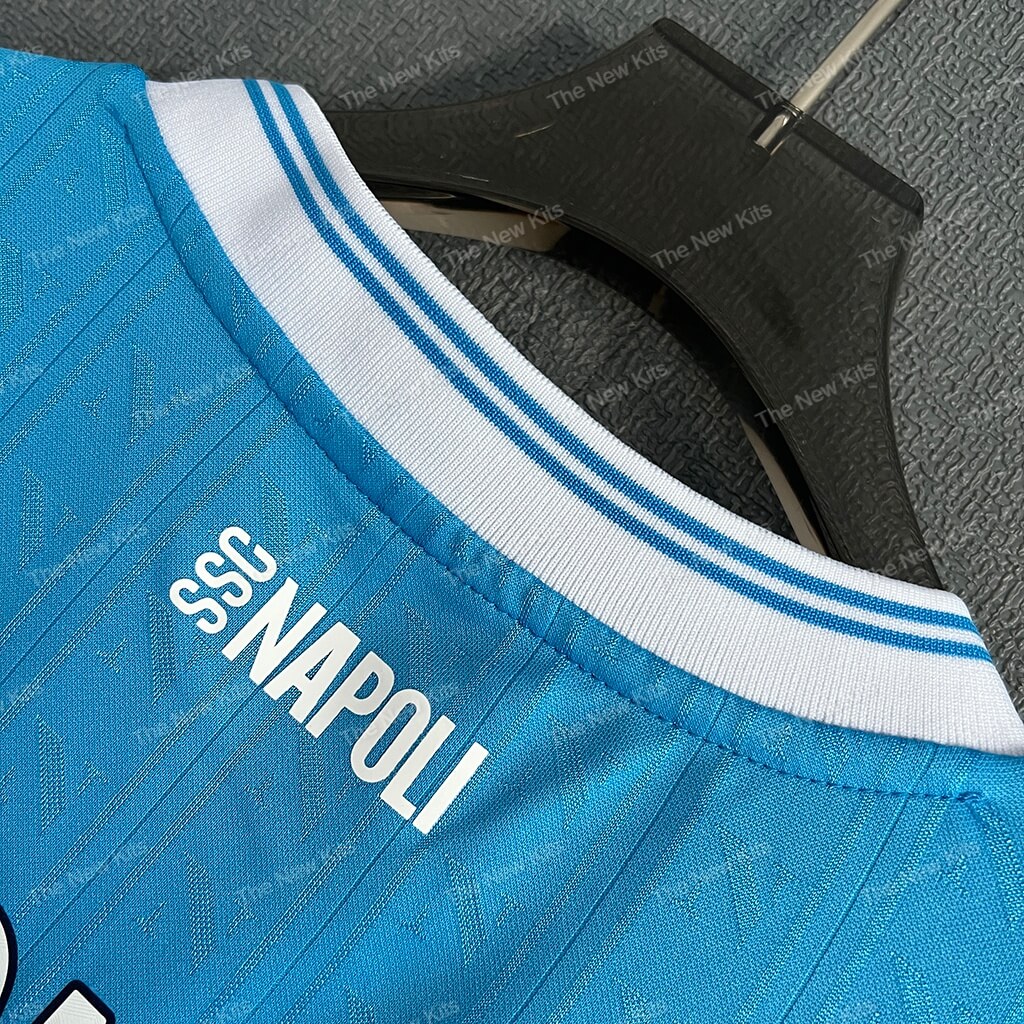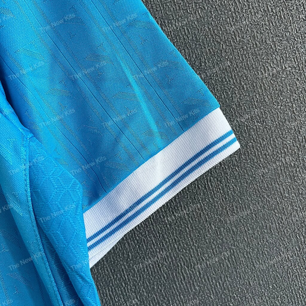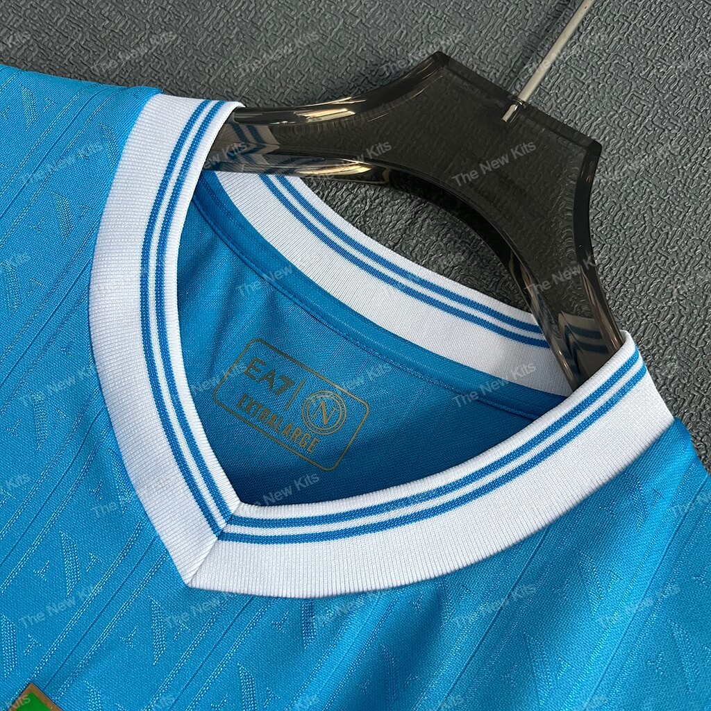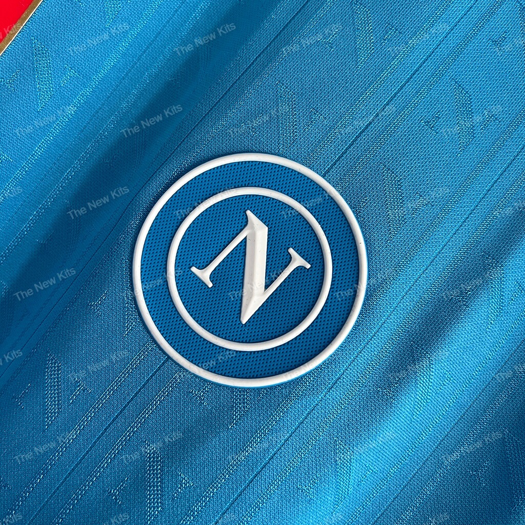 A luminous sky-blue field anchors the design while subtle embossed vertical detailing gives the fabric dimension. The tonal “N” motif woven into the stripe structure adds a tactile story that shows in close-ups and photographs beautifully from the stands. Minimalist collar piping and crisp white sleeve trim frame the crest and Scudetto precisely, so every angle reads clean and iconic.