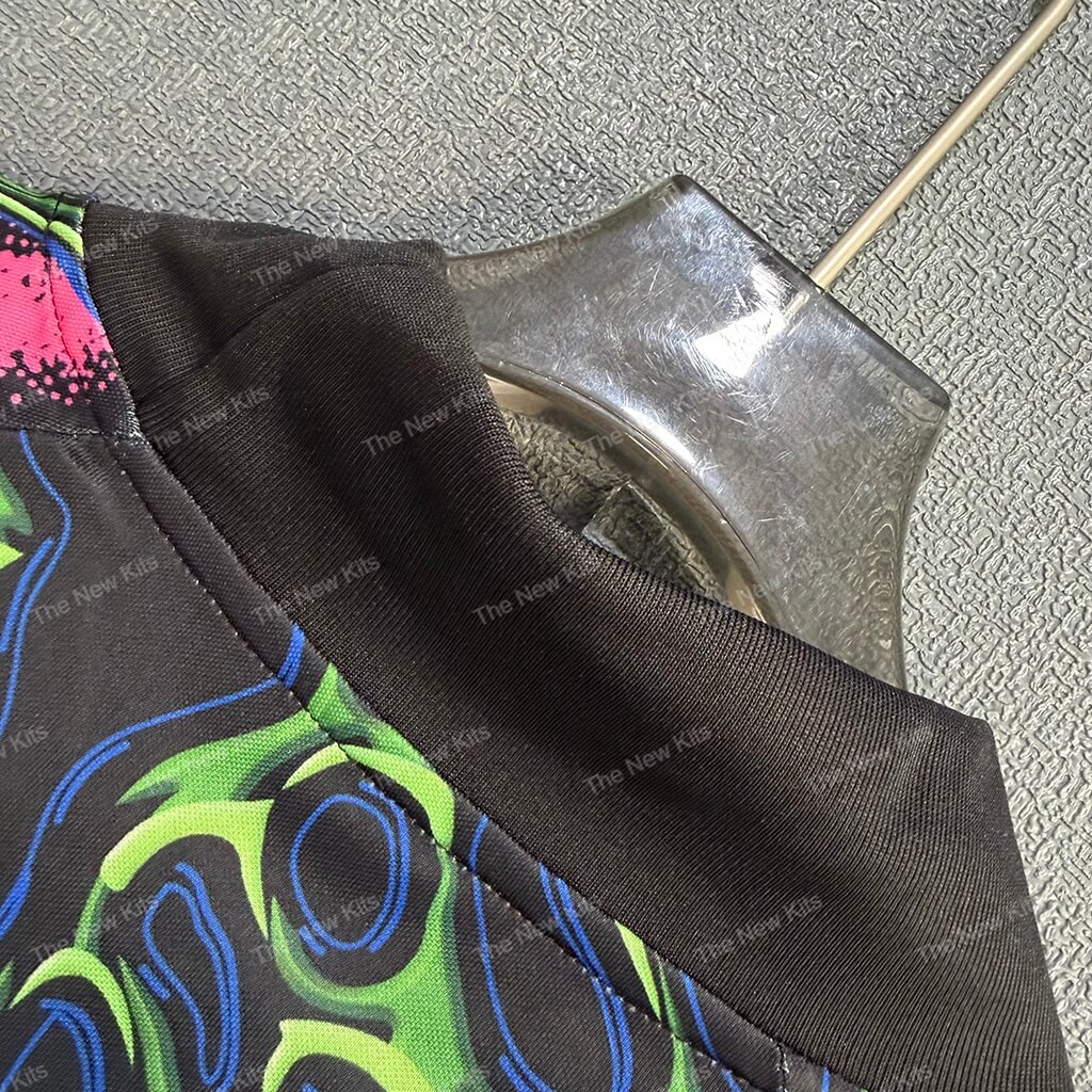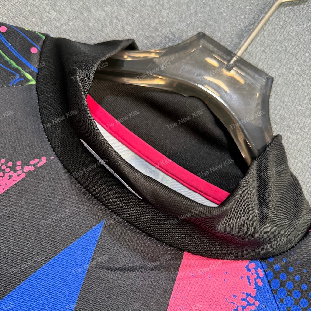 The nigeria kit features a dominant navy blue base accented by high-visibility “Volt” and “Pink Blast” graphics. A massive, central star motif anchors the chest, serving as a direct nod to the iconic goalkeeper silhouettes of the past. Furthermore, the design utilizes psychedelic, swirling patterns in green and magenta to create a truly hypnotic visual impact.