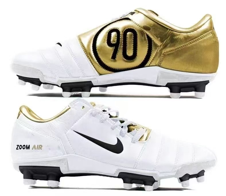 The total 90 football boots are back in stunning fashion, bringing their legendary status into the modern game. This time, the boots arrive with a jaw-dropping gold and white colorway that perfectly blends heritage with luxury. Instantly recognizable by the bold “90” logo, these boots were once the weapon of choice for some of football’s fiercest attackers, delivering unmatched power and precision.