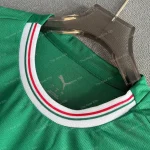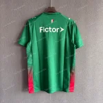 The palmeiras fc shirt features a classic forest green base enhanced by a subtle, tonal pinstripe texture throughout the fabric. This version utilizes a refined white and red striped “hybrid U” collar to provide a sharp, athletic frame for the jersey. Furthermore, the design incorporates sublimated green and red stripes on the sides, serving as a direct tribute to the club’s Italian heritage.