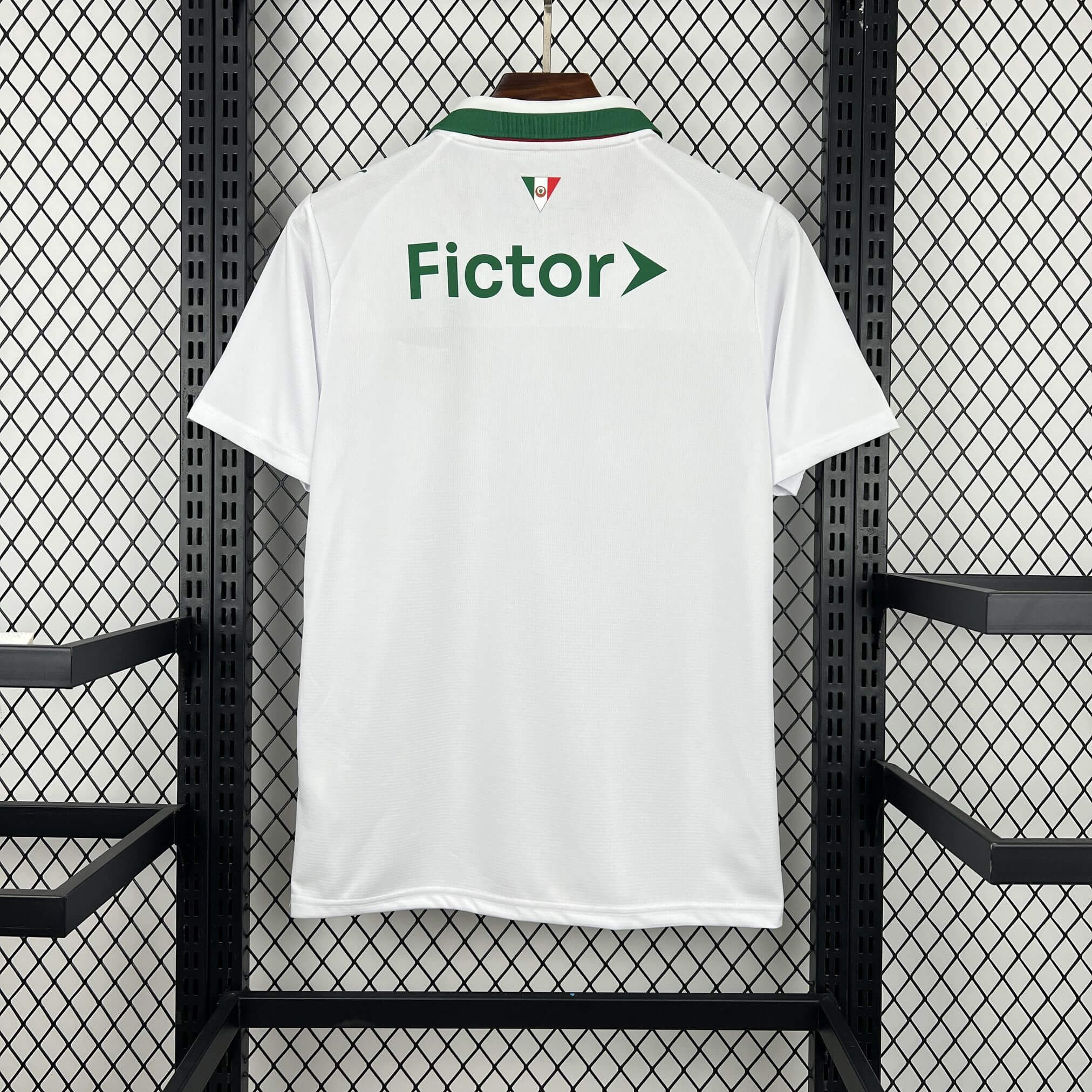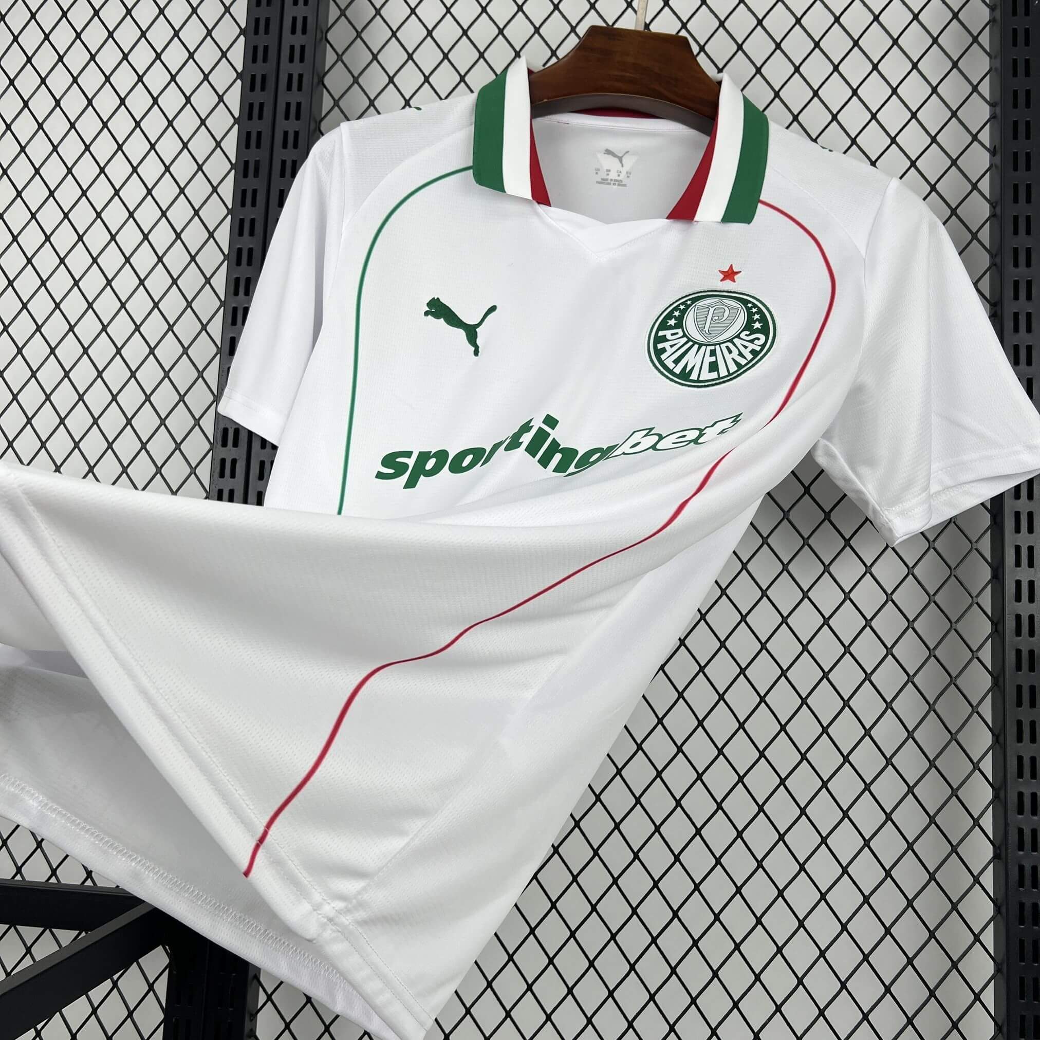 The palmeiras football kit features a pristine white base that serves as a canvas for the club’s iconic green and red accents. The design incorporates a refined polo-style collar, which adds a touch of classic elegance to the sportswear. Furthermore, thin, curved piping in green and red flows down the sides of the torso to represent the national colors of the club’s Italian heritage.