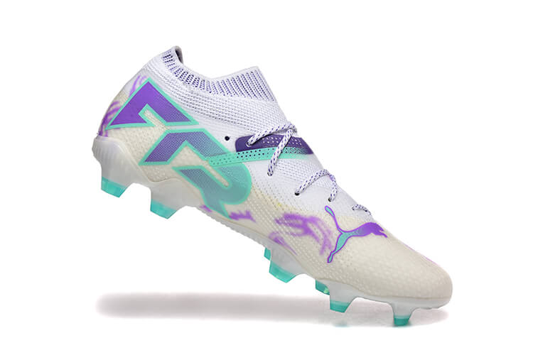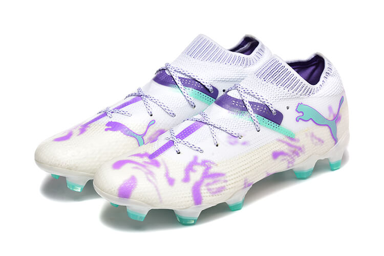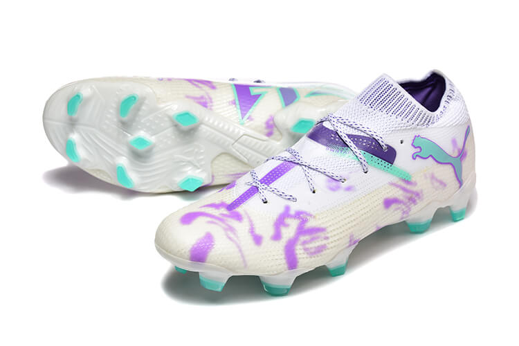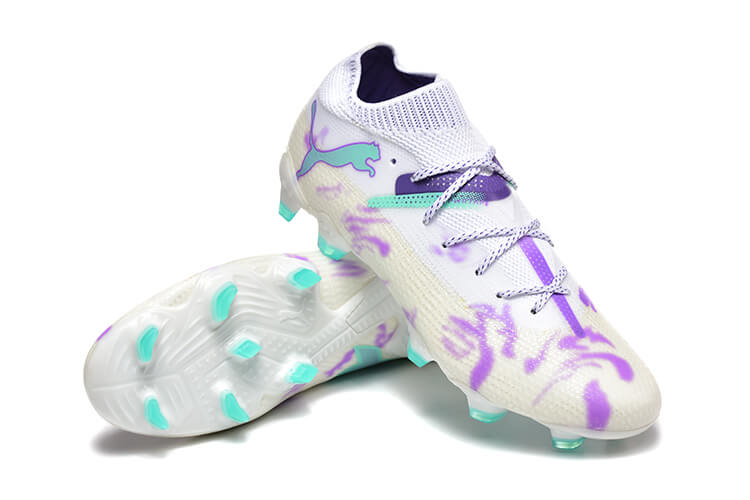 Puma soccer cleats set a new standard in football footwear with their bold design and cutting-edge technology. They are crafted for players who want both agility and flair on the pitch. These cleats aren’t just gear—they express individuality and power. The boots in the image feature a clean white base with vibrant purple graffiti-like accents. Aqua blue details add a striking contrast, creating an artistic and dynamic look.
