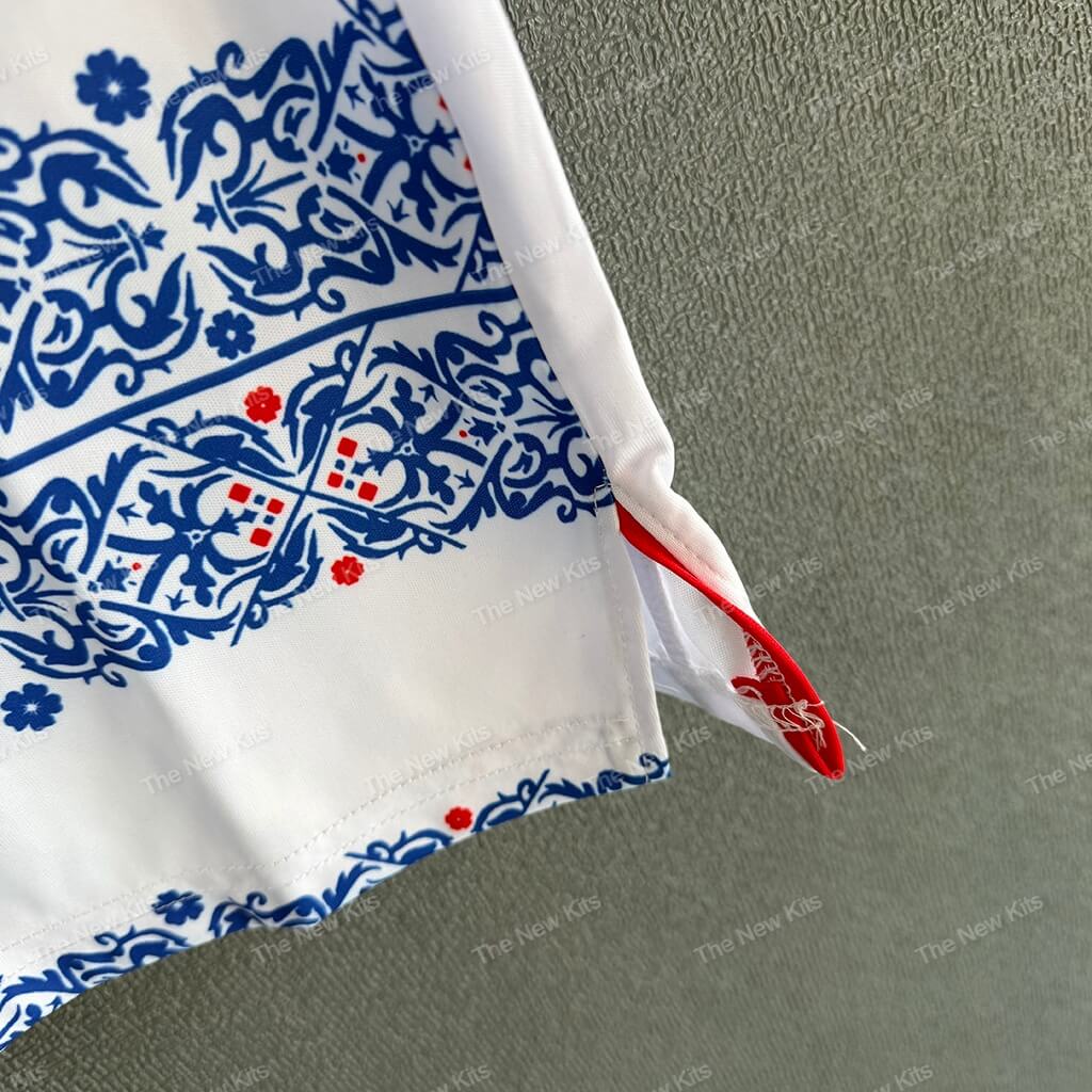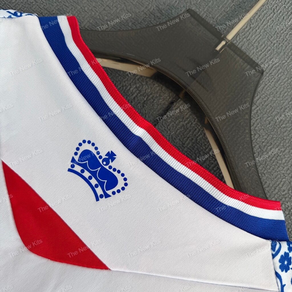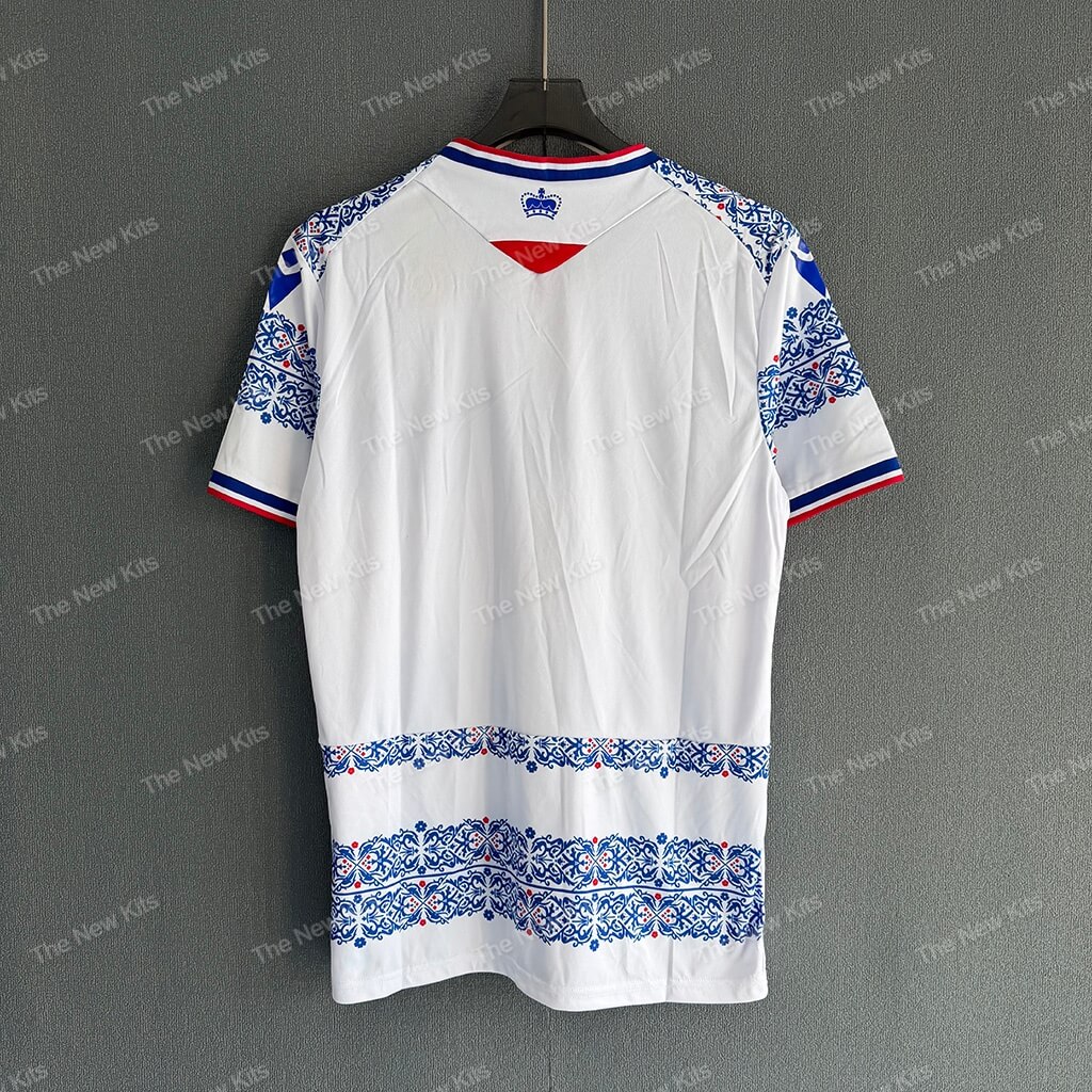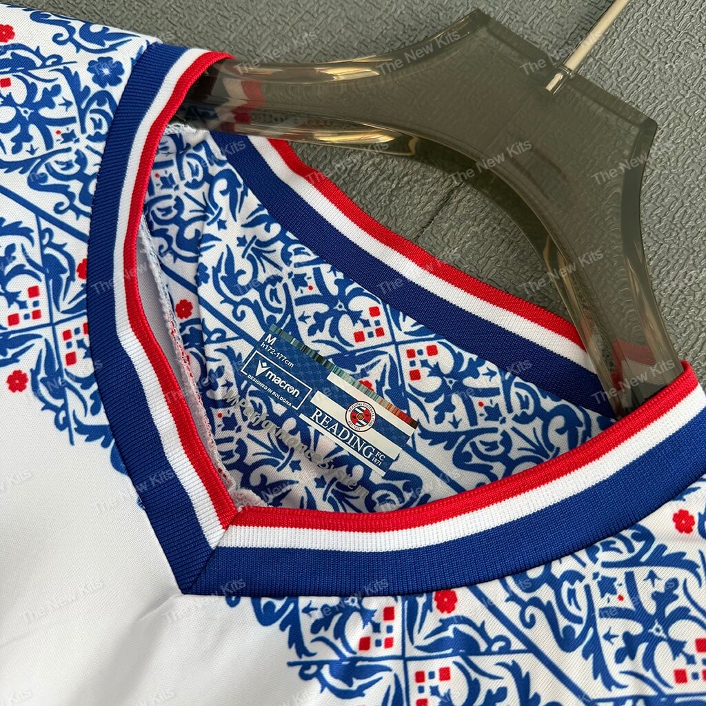 The reading fc kit features a crisp white base. Intricate blue floral hoops run horizontally across the body for a unique aesthetic. This design provides a sharp, modern silhouette while staying true to the club’s roots. Vibrant red accents on the collar and cuffs add a powerful visual contrast. ✨