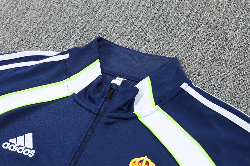 Dial in pro standards with the real madrid training suit for the 2025/26 season. This two-piece adidas set pairs a sleek navy quarter-zip top with tapered training pants. Bright solar-yellow flashes and crisp white 3-Stripes frame the Real Madrid crest for a sharp Valdebebas-ready look. Lightweight, quick-dry fabric keeps you comfortable whether you’re grinding through rondos, travelling to a match, or repping Los Blancos around town.