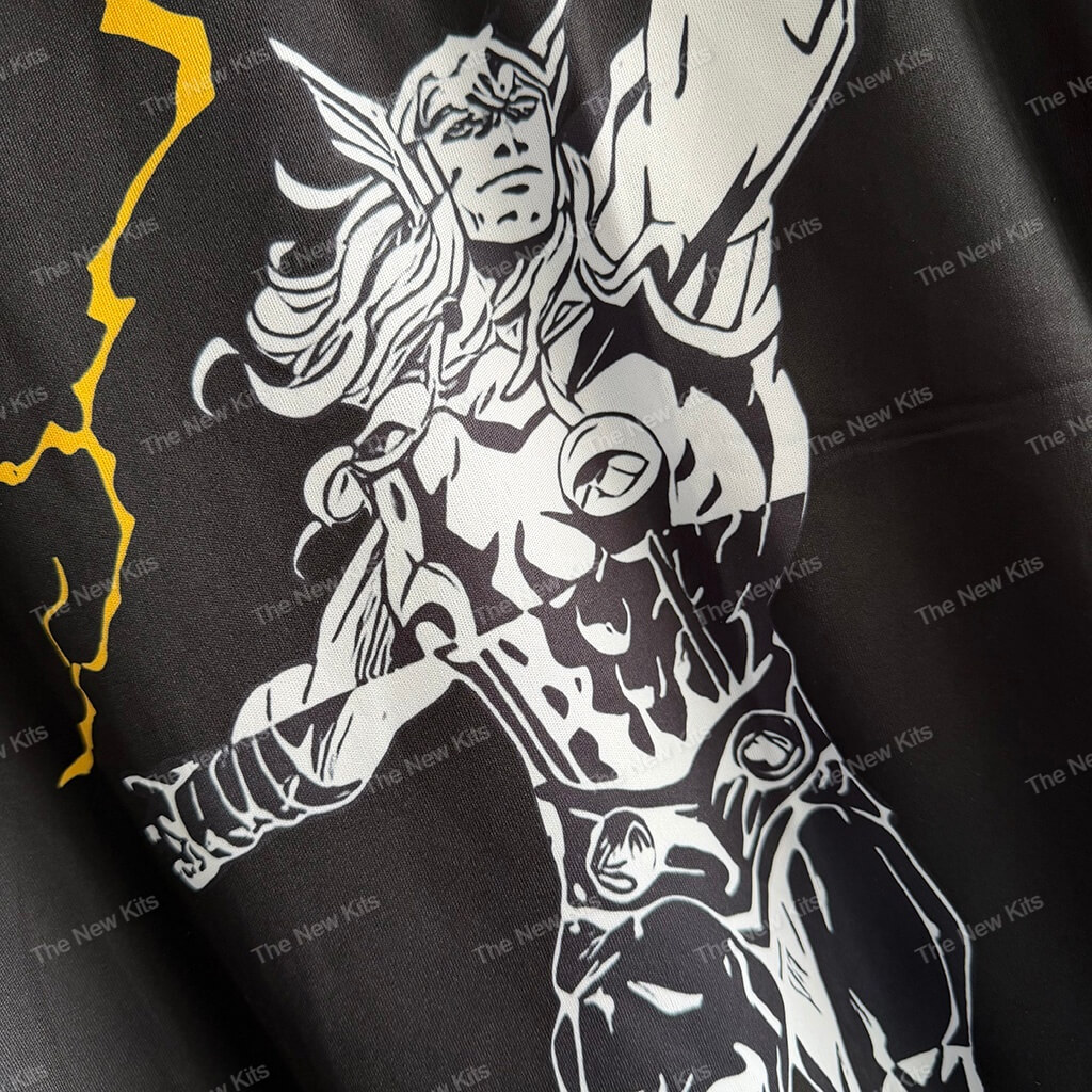 The real madrid marvel kit features a sleek “Stealth Black” base with explosive “Electric Yellow” lightning graphics. ⚡ A striking, hand-drawn illustration of Thor wielding Mjolnir powers the front design. This artistic approach creates a sharp, modern silhouette that transcends any standard real madrid football shirt. ✨