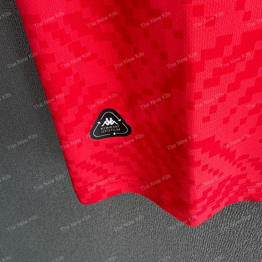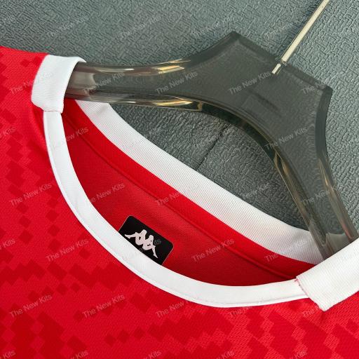 Bright white details frame the design perfectly. A crisp white crew neck collar and matching sleeve cuffs cut through the red, creating that classic Tunisia contrast. On the shoulders and sleeves, the Kappa logos sit proudly, while over the heart the national crest glows with its iconic star and crescent, reminding you exactly who you’re playing or cheering for.