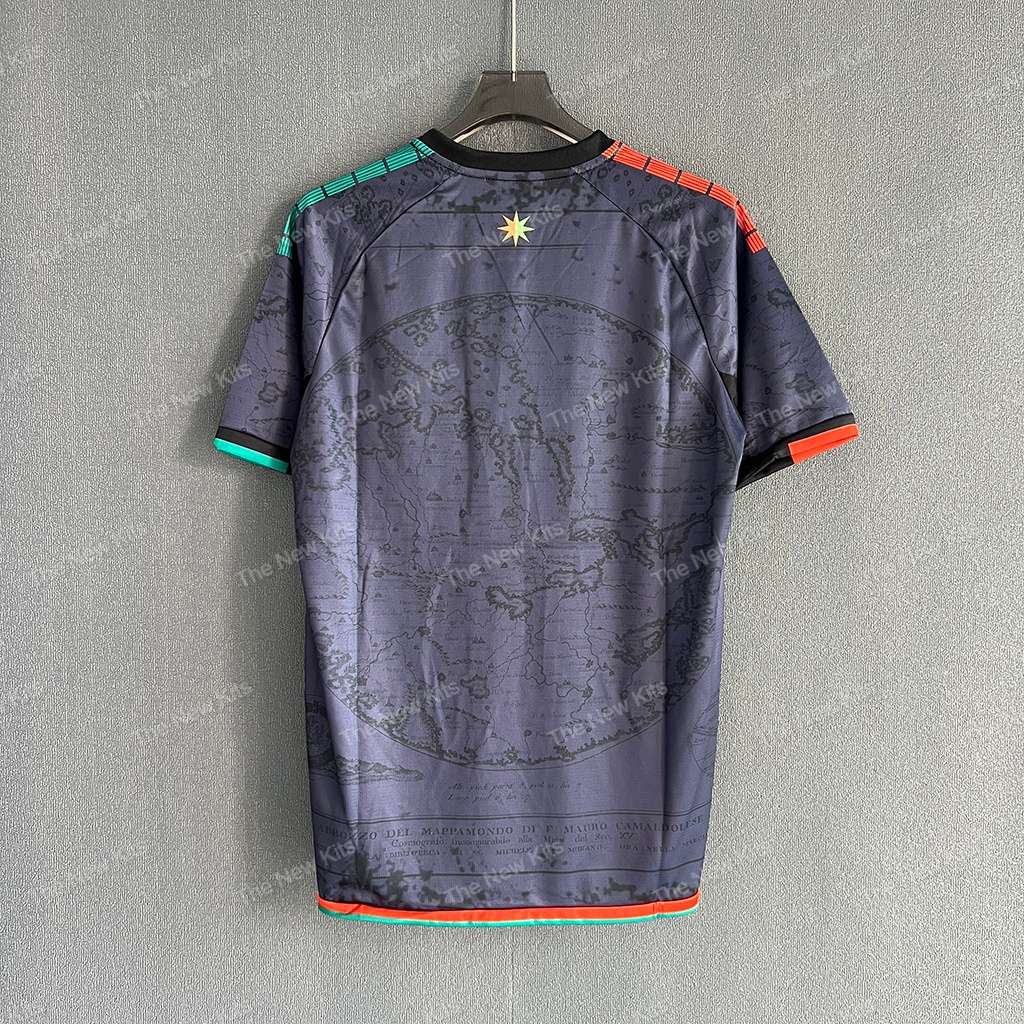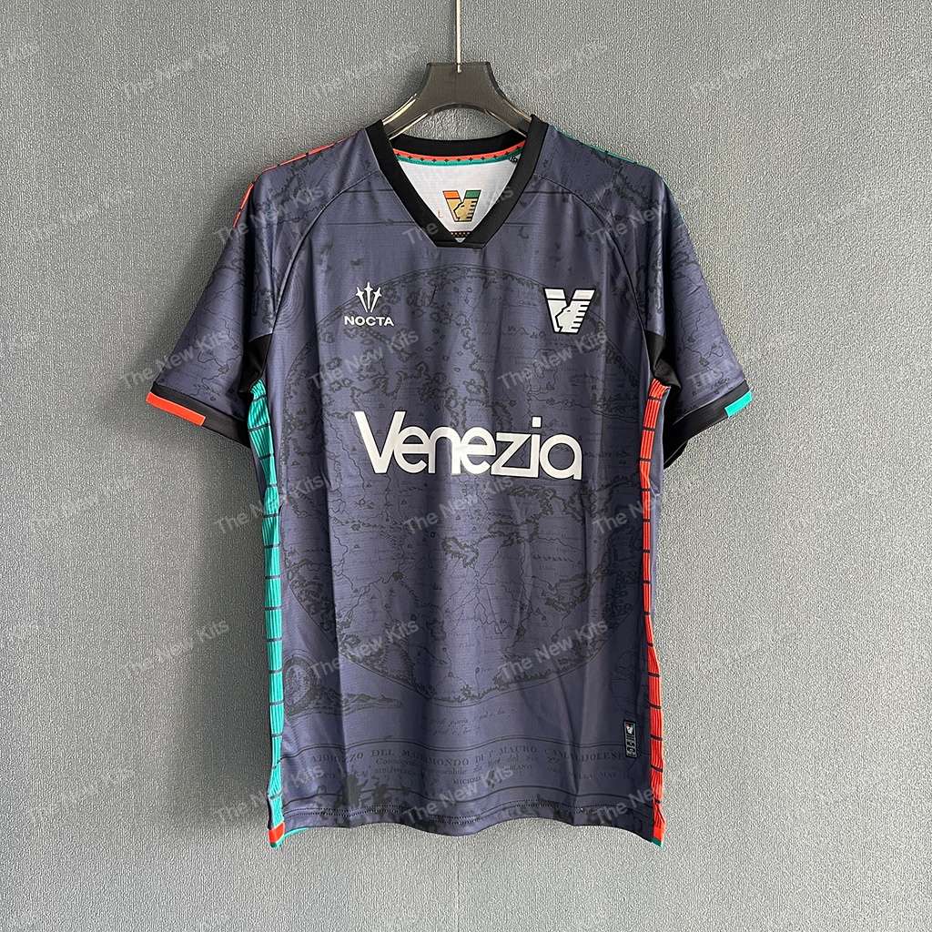 At the heart of the design is a layered jacquard inspired by 15th-century cartography — subtle map-like motifs woven into the fabric to evoke Venice’s canals and storied trade routes. The chest carries a wide, silver Venezia wordmark and low-profile NOCTA treatments that read premium under stadium lights. Orange and green trim lines run from shoulder to hem, giving the shirt energy in motion and a clear nod to club identity.